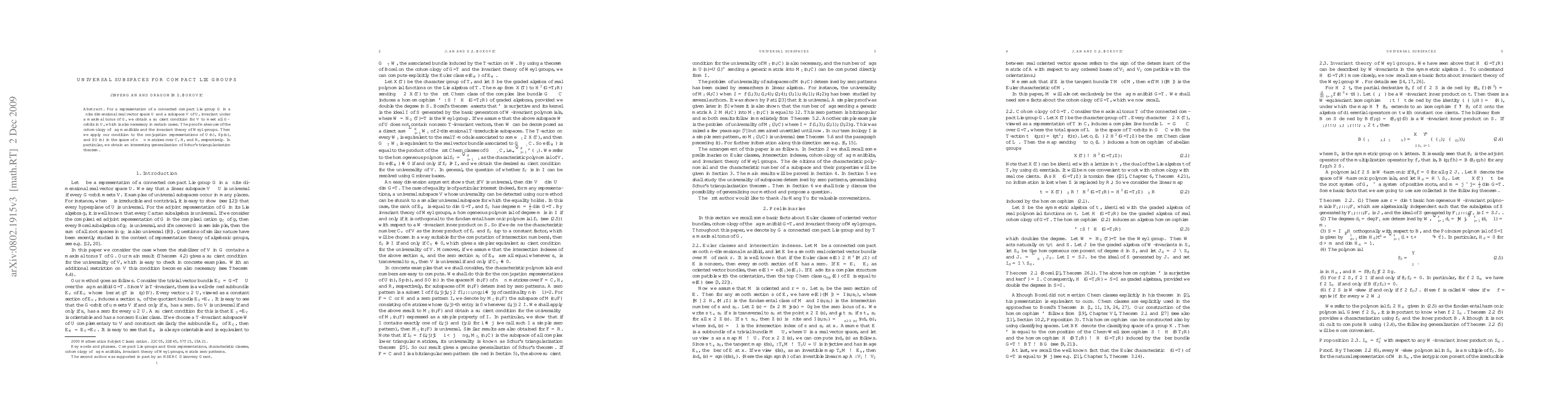 This paper establishes a sufficient condition for subspaces invariant under a maximal torus of a compact Lie group to intersect all group orbits, using cohomology of flag manifolds and Weyl group invariant theory. It applies this condition to conjugation representations of U(n), Sp(n), and SO(n), leading to a generalization of Schur's triangularization theorem.