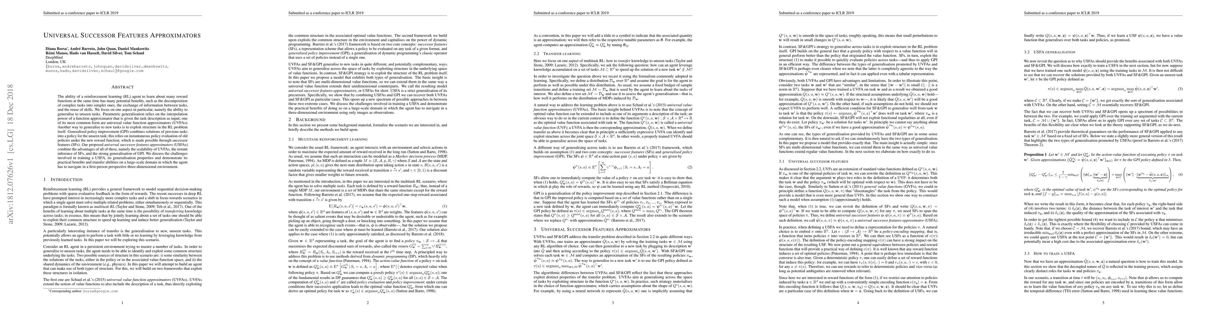 This paper proposes universal successor features approximators (USFAs) to enhance reinforcement learning agents' ability to generalise to unseen tasks by combining the strengths of universal value function approximators, successor features, and generalised policy improvement. The authors demonstrate the practical benefits and transfer abilities of USFAs in a large-scale navigation environment.
