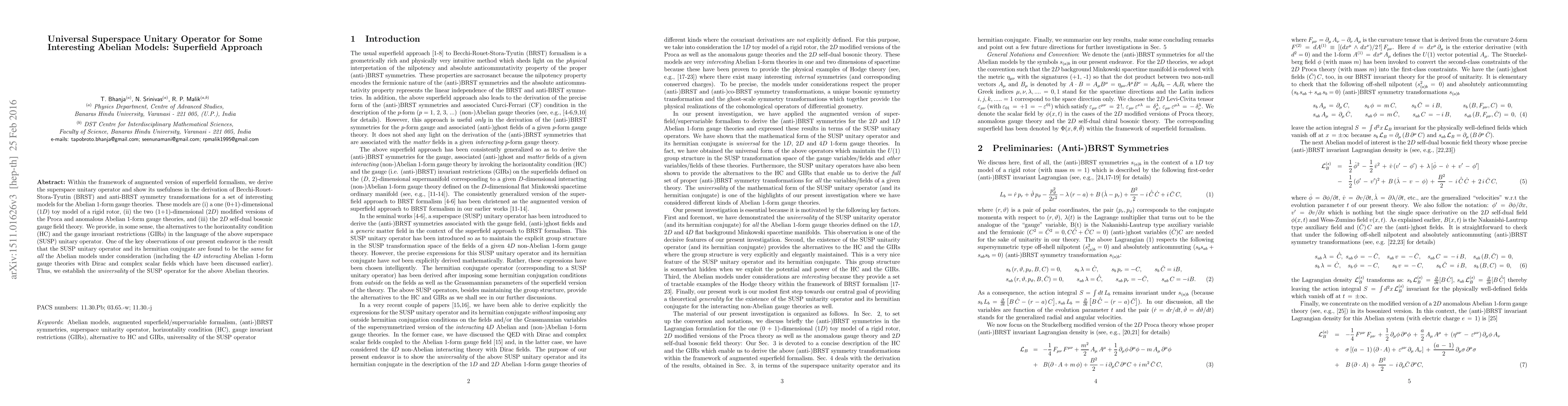 Within the framework of augmented version of superfield formalism, we derive the superspace unitary operator and show its usefulness in the derivation of Becchi-Rouet-Stora-Tyutin (BRST) and anti-BRST symmetry transformations for a set of interesting models for the Abelian 1-form gauge theories. These models are (i) a one (0+1)-dimensional (1D) toy model of a rigid rotor, (ii) the two (1+1)-dimensional (2D) modified versions of the Proca and anomalous Abelian 1-form gauge theories, and (iii) the 2D self-dual bosonic gauge field theory. We provide, in some sense, the alternatives to the horizontality condition (HC) and the gauge invariant restrictions (GIRs) in the language of the above superspace (SUSP) unitary operator. One of the key observations of our present endeavor is the result that the SUSP unitary operator and its hermitian conjugate are found to be the same for all the Abelian models under consideration (including the 4D interacting Abelian 1-form gauge theories with Dirac and complex scalar fields which have been discussed earlier). Thus, we establish the universality of the SUSP operator for the above Abelian theories.