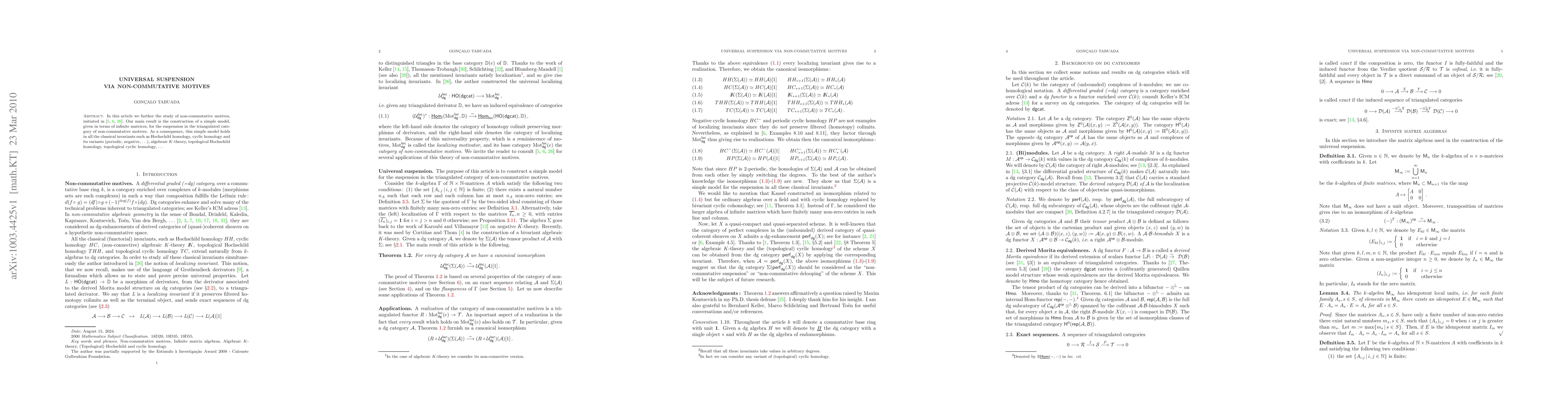 This paper constructs a universal suspension model using infinite matrices in the triangulated category of non-commutative motives, which is applicable across various classical invariants including Hochschild homology, cyclic homology, and K-theory.