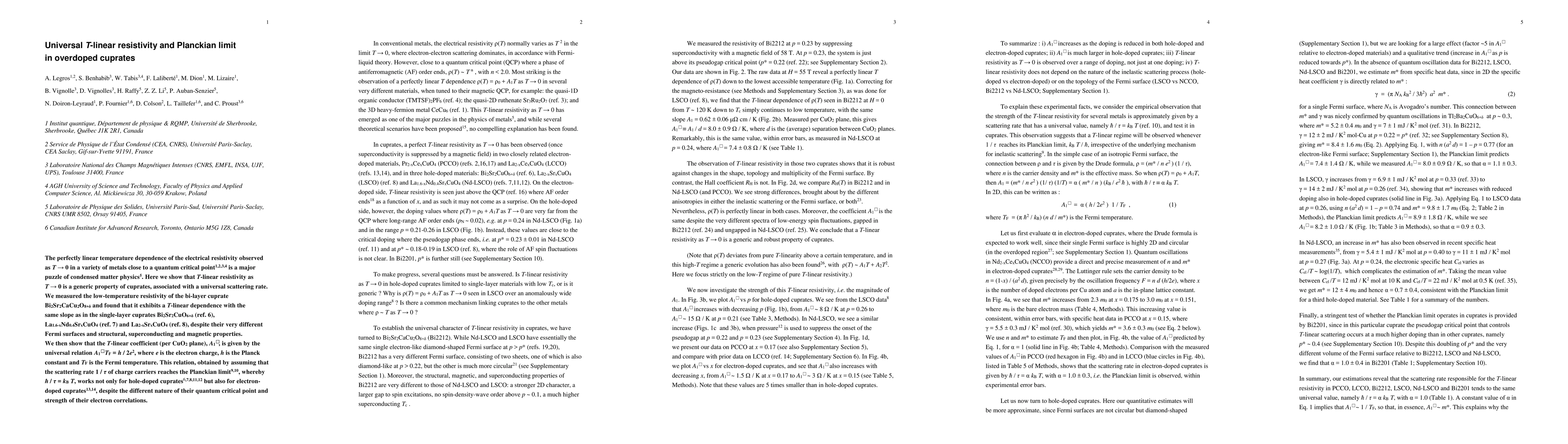 This paper demonstrates that $T$-linear resistivity near absolute zero is a universal feature in overdoped cuprates, linked to a common scattering rate. The study reveals a Planckian relation for the $T$-linear coefficient in these materials, suggesting a fundamental connection between their resistivity and quantum criticality.