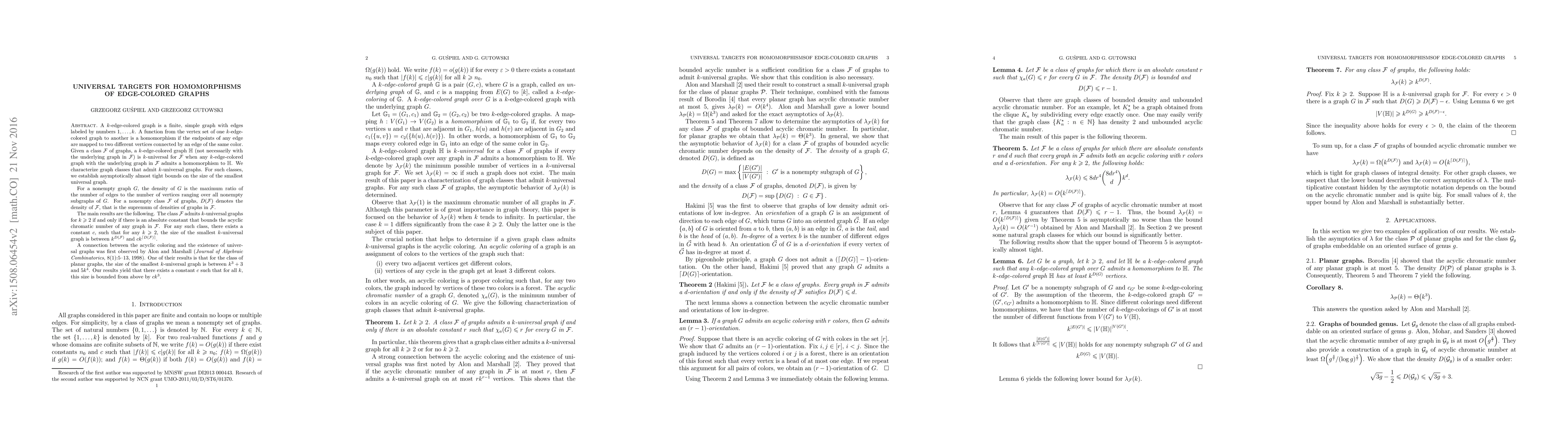 The paper investigates universal targets for homomorphisms in $k$-edge-colored graphs, establishing conditions under which a class $\mathcal{F}$ of graphs admits $k$-universal graphs and providing bounds on their size. It concludes that such classes require an absolute bound on their acyclic chromatic number, with the smallest universal graph's size scaling asymptotically between $k^{D(\mathcal{F})}$ and $ck^{\lceil D(\mathcal{F})\rceil}$.