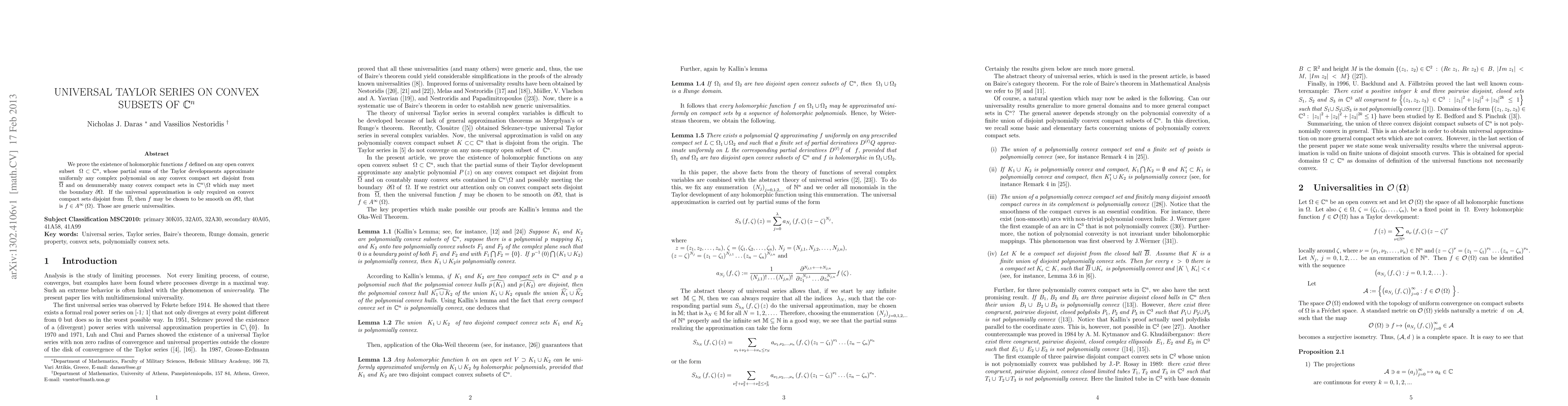 We prove the existence of holomorphic functions $f$ defined on any open convex subset ${\rm \Omega}\subset {{\mathbb C}}^n$, whose partial sums of the Taylor developments approximate uniformly any complex polynomial on any convex compact set disjoint from $\bar{{\rm \Omega}}$ and on denumerably many convex compact sets in ${{\mathbb C}}^n\backslash {\rm \Omega}$ which may meet the boundary $\partial {\rm \Omega}$. If the universal approximation is only required on convex compact sets disjoint from $\bar{{\rm \Omega}}$, then $f$ may be chosen to be smooth on $\partial {\rm \Omega}$, that is $f\in A^{\infty}({\rm \Omega})$. Those are generic universalities.