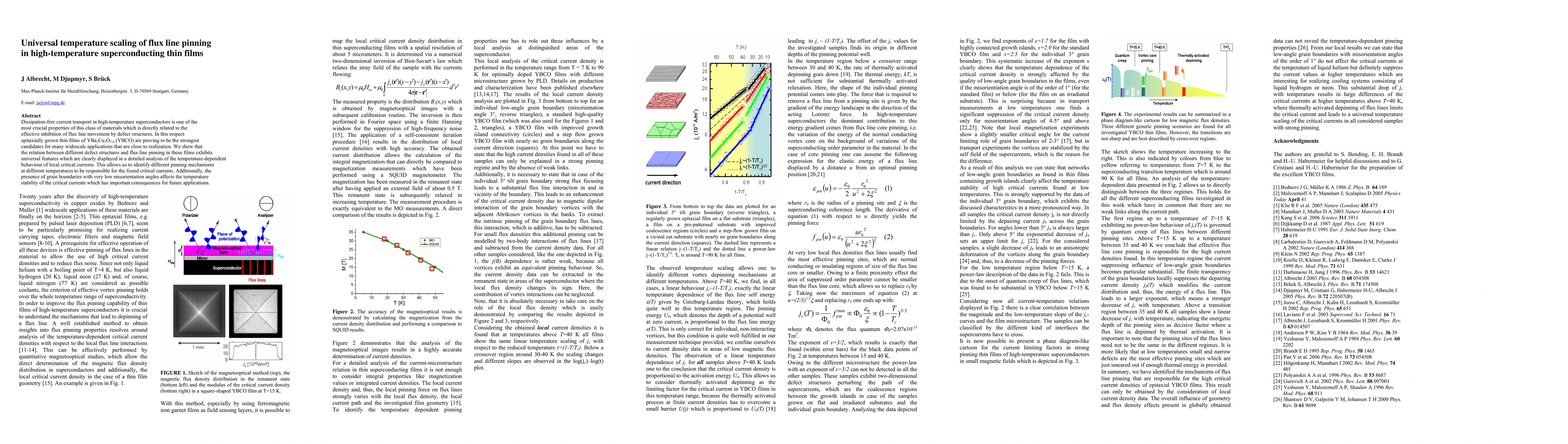 Dissipation-free current transport in high-temperature superconductors is one of the most crucial properties of this class of materials which is directly related to the effective inhibition of flux line movement by defect structures. In this respect epitaxially grown thin films of YBa2Cu3O7-d (YBCO) are proving to be the strongest candidates for many widescale applications that are close to realization. We show that the relation between different defect structures and flux line pinning in these films exhibits universal features which are clearly displayed in a detailed analysis of the temperature-dependent behaviour of local critical currents. This allows us to identify different pinning mechanisms at different temperatures to be responsible for the found critical currents. Additionally, the presence of grain boundaries with very low misorientation angles affects the temperature stability of the critical currents which has important consequences for future applications.