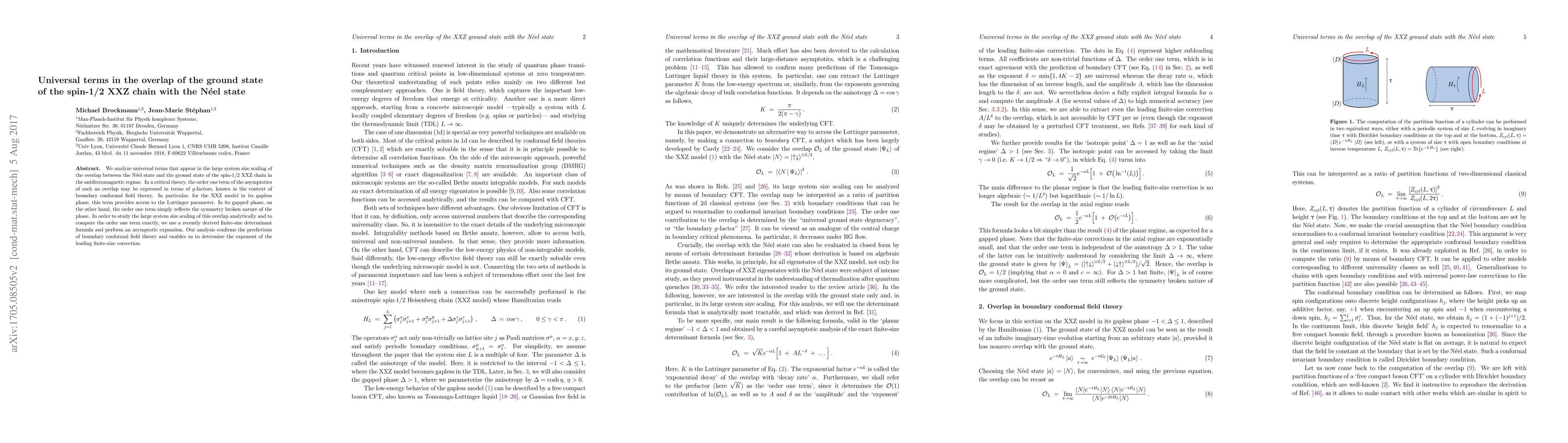 We analyze universal terms that appear in the large system size scaling of the overlap between the N\'eel state and the ground state of the spin-1/2 XXZ chain in the antiferromagnetic regime. In a critical theory, the order one term of the asymptotics of such an overlap may be expressed in terms of $g$-factors, known in the context of boundary conformal field theory. In particular, for the XXZ model in its gapless phase, this term provides access to the Luttinger parameter. In its gapped phase, on the other hand, the order one term simply reflects the symmetry broken nature of the phase. In order to study the large system size scaling of this overlap analytically and to compute the order one term exactly, we use a recently derived finite-size determinant formula and perform an asymptotic expansion. Our analysis confirms the predictions of boundary conformal field theory and enables us to determine the exponent of the leading finite-size correction.