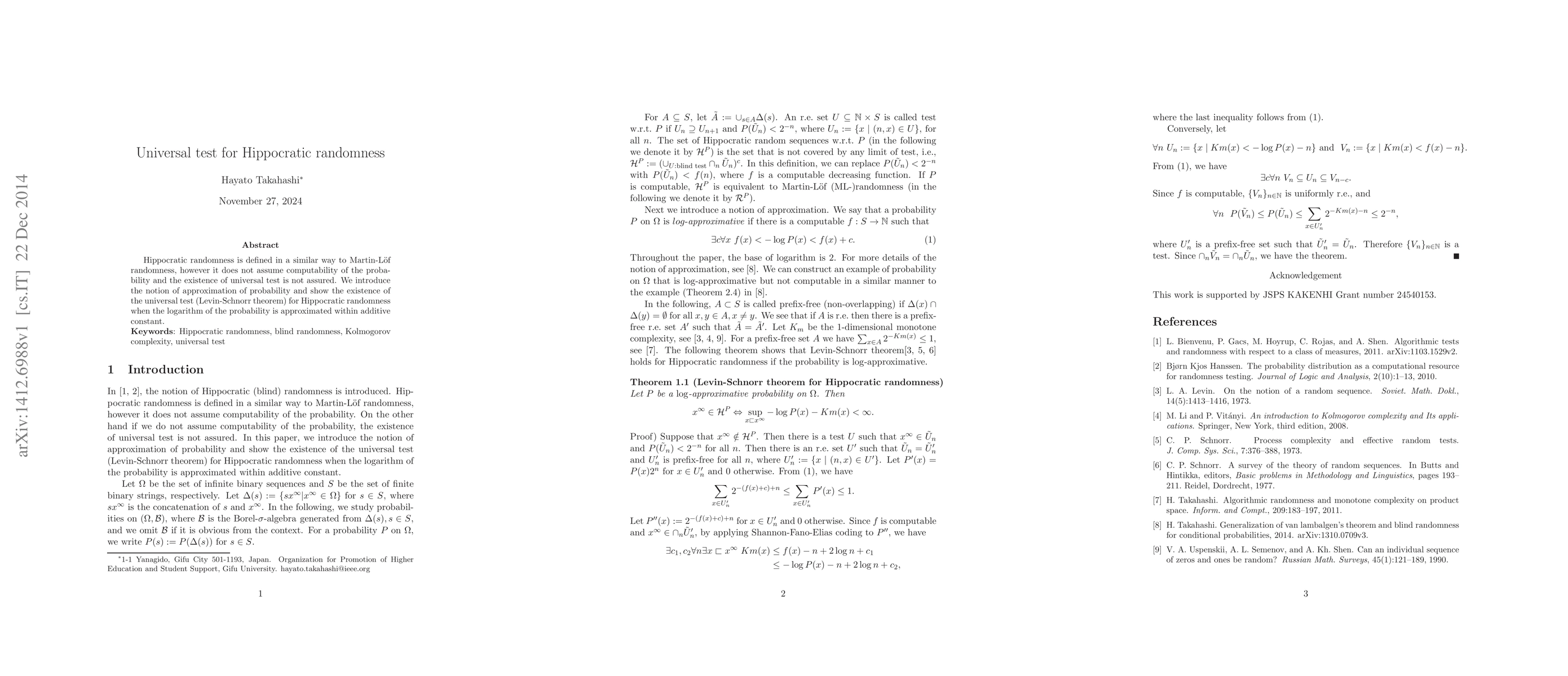 Hippocratic randomness is defined in a similar way to Martin-Lof randomness, however it does not assume computability of the probability and the existence of universal test is not assured. We introduce the notion of approximation of probability and show the existence of the universal test (Levin-Schnorr theorem) for Hippocratic randomness when the logarithm of the probability is approximated within additive constant.
