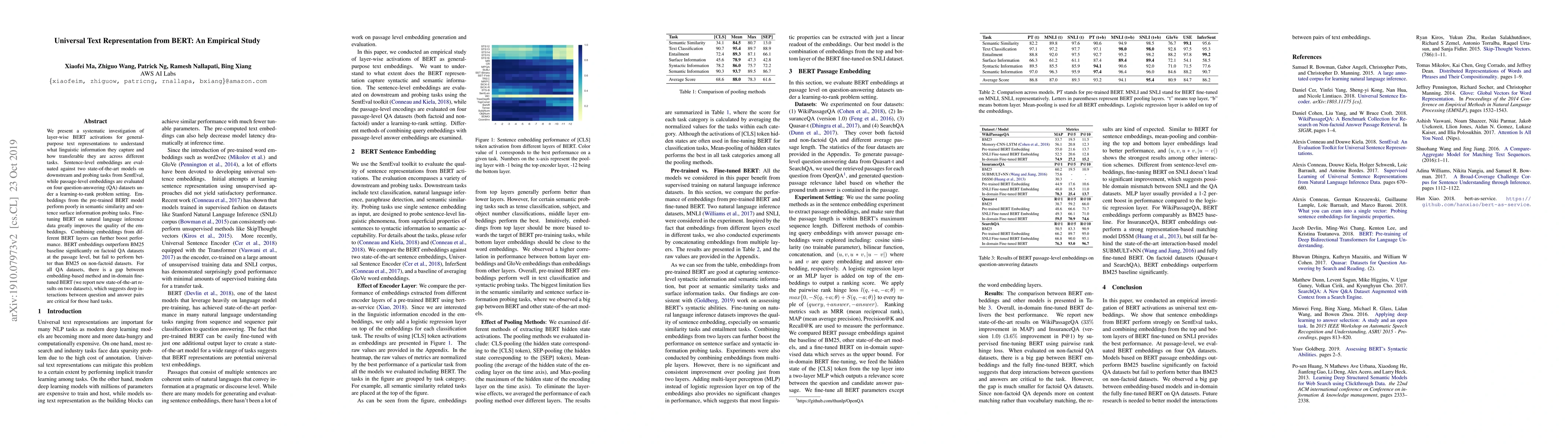 We present a systematic investigation of layer-wise BERT activations for general-purpose text representations to understand what linguistic information they capture and how transferable they are across different tasks. Sentence-level embeddings are evaluated against two state-of-the-art models on downstream and probing tasks from SentEval, while passage-level embeddings are evaluated on four question-answering (QA) datasets under a learning-to-rank problem setting. Embeddings from the pre-trained BERT model perform poorly in semantic similarity and sentence surface information probing tasks. Fine-tuning BERT on natural language inference data greatly improves the quality of the embeddings. Combining embeddings from different BERT layers can further boost performance. BERT embeddings outperform BM25 baseline significantly on factoid QA datasets at the passage level, but fail to perform better than BM25 on non-factoid datasets. For all QA datasets, there is a gap between embedding-based method and in-domain fine-tuned BERT (we report new state-of-the-art results on two datasets), which suggests deep interactions between question and answer pairs are critical for those hard tasks.