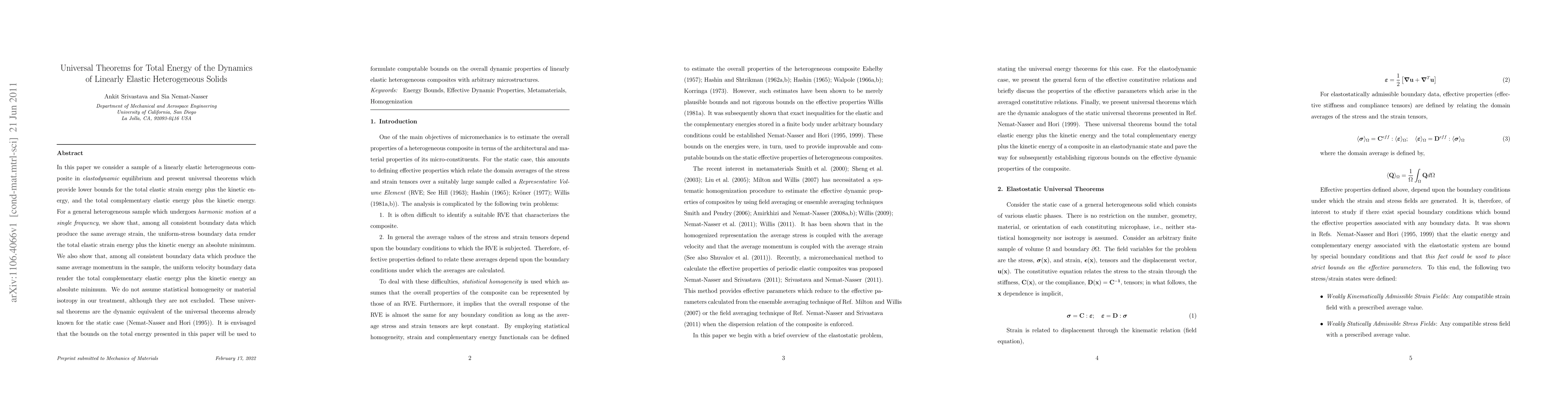 In this paper we consider a sample of a linearly elastic heterogeneous composite in elastodynamic equilibrium and present universal theorems which provide lower bounds for the total elastic strain energy plus the kinetic energy, and the total complementary elastic energy plus the kinetic energy. For a general heterogeneous sample which undergoes harmonic motion at a single frequency, we show that, among all consistent boundary data which produce the same average strain, the uniform-stress boundary data render the total elastic strain energy plus the kinetic energy an absolute minimum. We also show that, among all consistent boundary data which produce the same average momentum in the sample, the uniform velocity boundary data render the total complementary elastic energy plus the kinetic energy an absolute minimum. We do not assume statistical homogeneity or material isotropy in our treatment, although they are not excluded. These universal theorems are the dynamic equivalent of the universal theorems already known for the static case (Nemat-Nasser and Hori 1995). It is envisaged that the bounds on the total energy presented in this paper will be used to formulate computable bounds on the overall dynamic properties of linearly elastic heterogeneous composites with arbitrary microstructures.