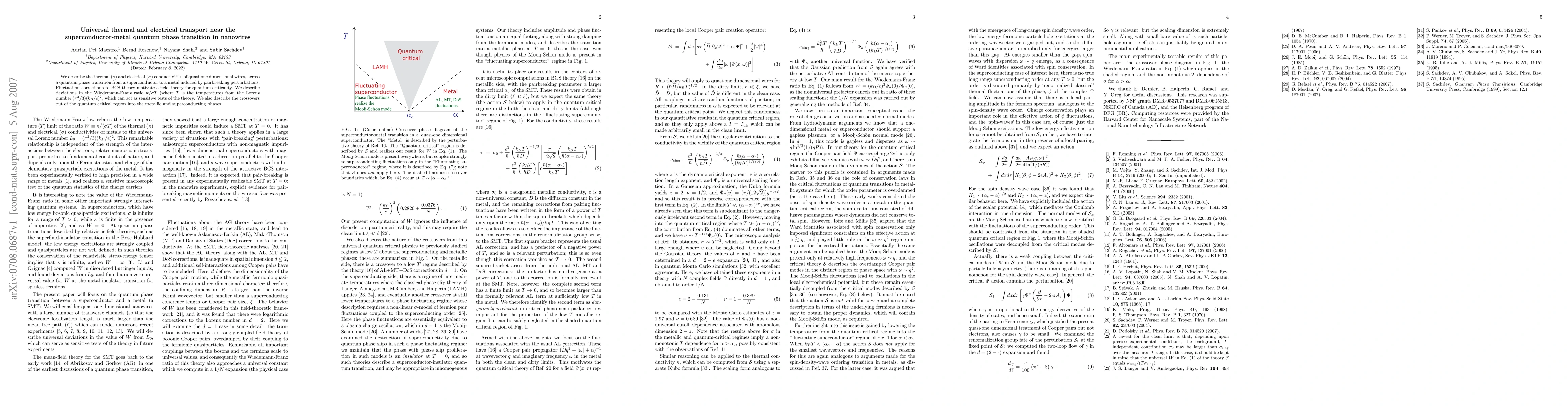 This paper investigates the thermal and electrical transport properties of quasi-one-dimensional nanowires undergoing a quantum phase transition from superconductor to metal, revealing deviations from BCS theory and the Lorenz number, and detailing the crossovers into metallic and superconducting phases. Fluctuation corrections and a field theory for quantum criticality are proposed to explain these observations.