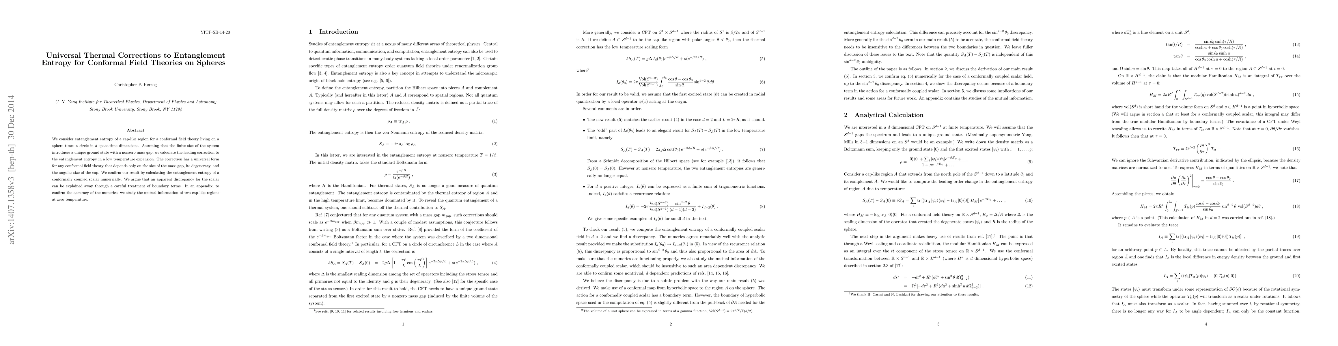 Researchers calculate a universal correction to entanglement entropy for conformal field theories on spheres, revealing its dependence on mass gap size, degeneracy, and angular size. The findings confirm the universality of the correction across various systems.