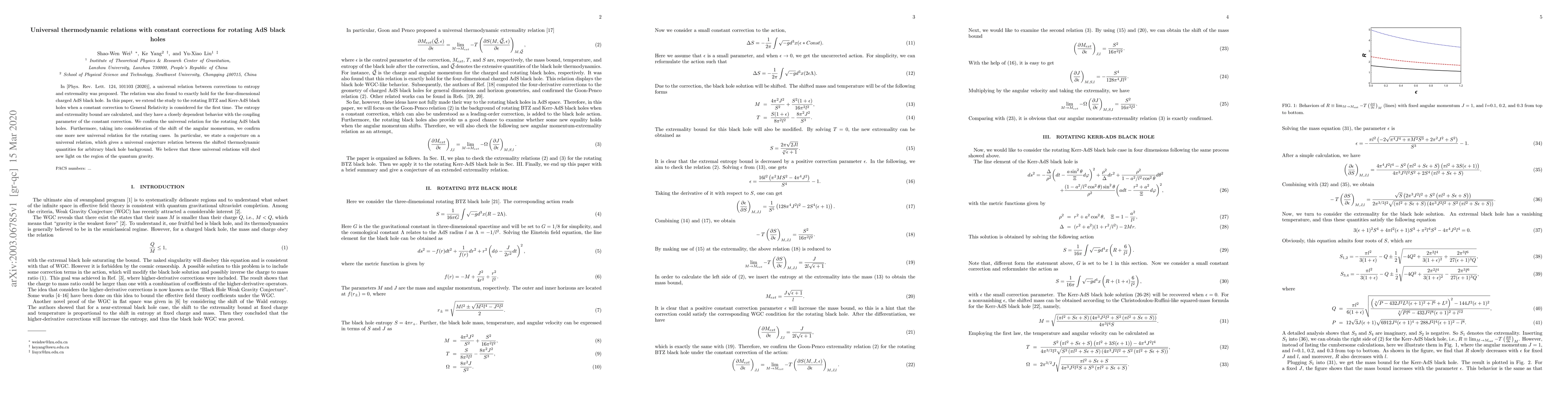 In [Phys. Rev. Lett. 124, 101103 (2020)], a universal relation between corrections to entropy and extremality was proposed. The relation was also found to exactly hold for the four-dimensional charged AdS black hole. In this paper, we extend the study to the rotating BTZ and Kerr-AdS black holes when a constant correction to General Relativity is considered for the first time. The entropy and extremality bound are calculated, and they have a closely dependent behavior with the coupling parameter of the constant correction. We confirm the universal relation for the rotating AdS black holes. Furthermore, taking into consideration of the shift of the angular momentum, we confirm one more new universal relation for the rotating cases. In particular, we state a conjecture on a universal relation, which gives a universal conjecture relation between the shifted thermodynamic quantities for arbitrary black hole background. We believe that these universal relations will shed new light on the region of the quantum gravity.