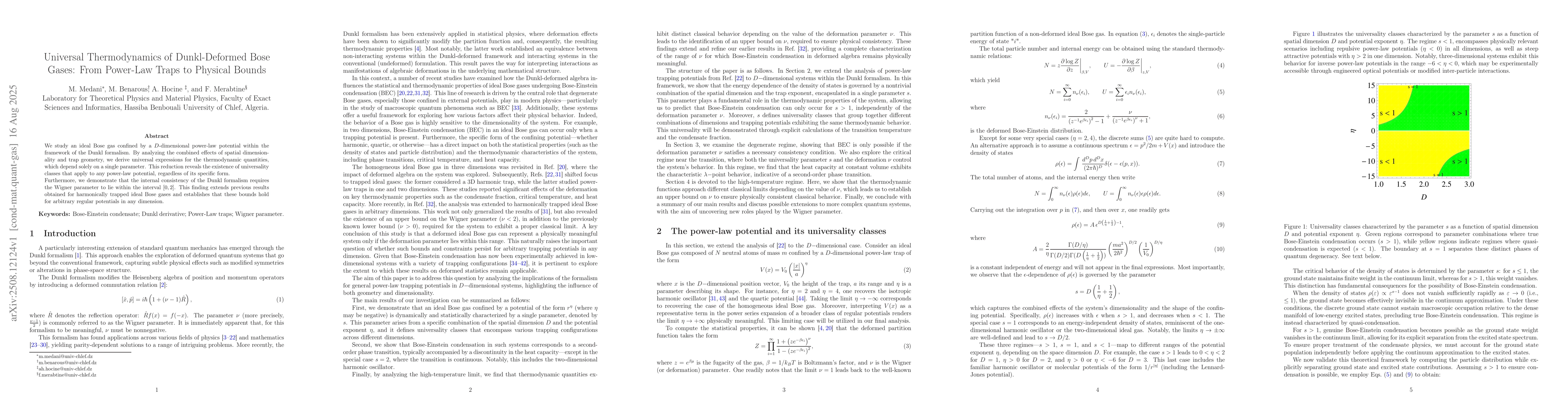 We study an ideal Bose gas confined by a $D$-dimensional power-law potential within the framework of the Dunkl formalism. By analyzing the combined effects of spatial dimensionality and trap geometry, we derive universal expressions for the thermodynamic quantities, which depend solely on a single parameter. This reduction reveals the existence of universality classes that apply to any power-law potential, regardless of its specific form.