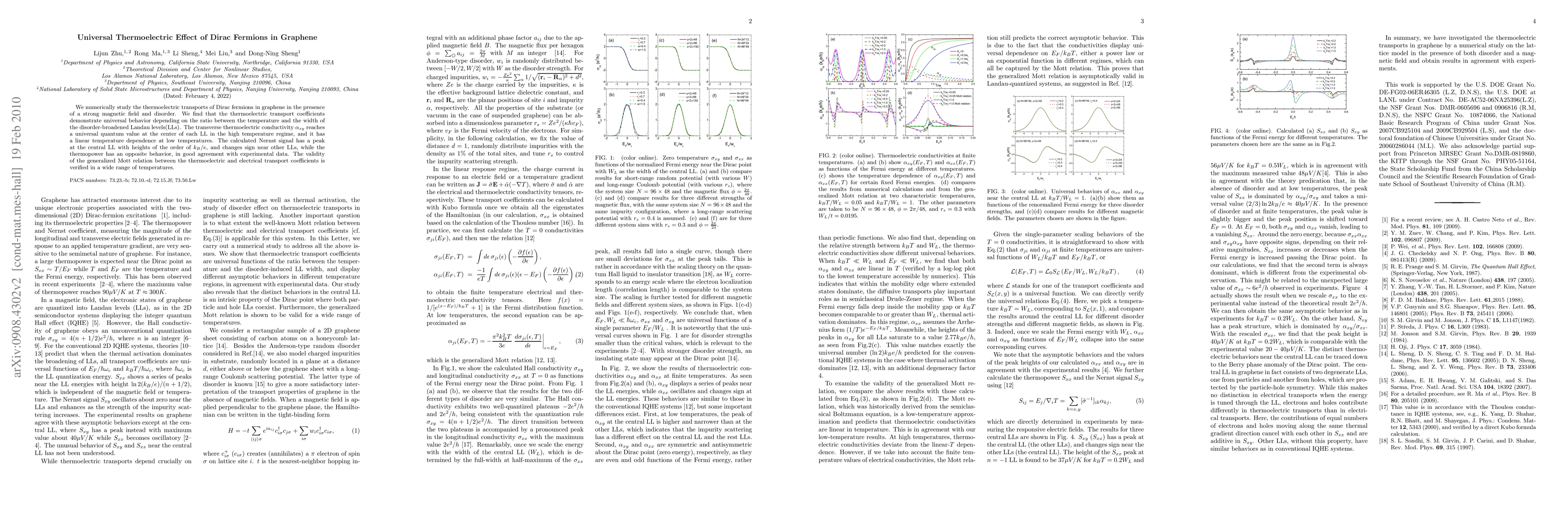 This paper investigates thermoelectric transport in graphene's Dirac fermions under a strong magnetic field and disorder, revealing universal behavior linked to the temperature-to-disorder-broadened Landau level ratio. The study finds a quantum value for the transverse thermoelectric conductivity at high temperatures, and verifies the generalized Mott relation across various temperatures.