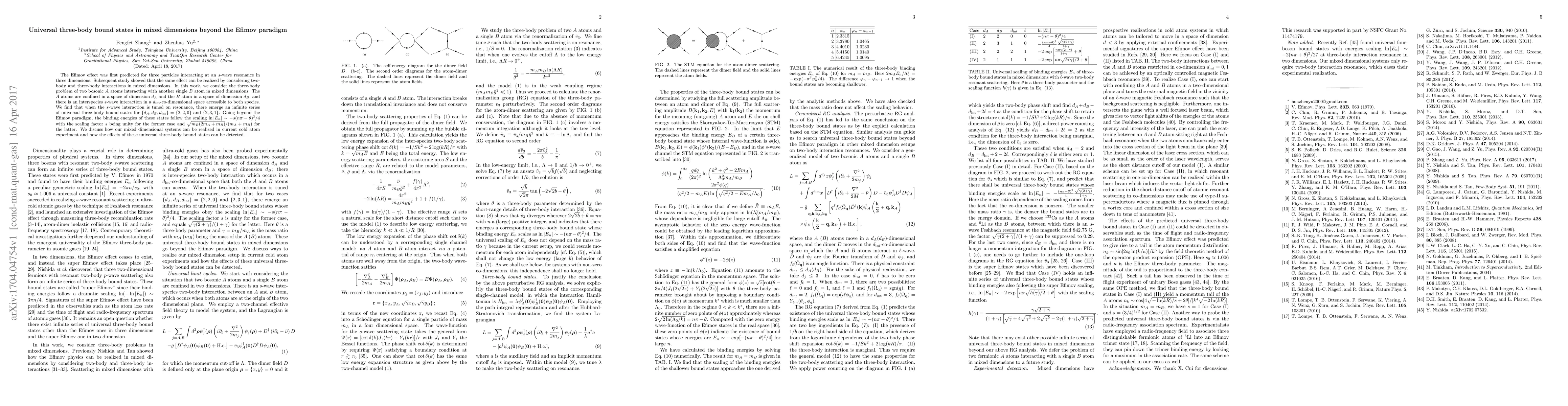 The Efimov effect was first predicted for three particles interacting at an $s$-wave resonance in three dimensions. Subsequent study showed that the same effect can be realized by considering two-body and three-body interactions in mixed dimensions. In this work, we consider the three-body problem of two bosonic $A$ atoms interacting with another single $B$ atom in mixed dimensions: The $A$ atoms are confined in a space of dimension $d_A$ and the $B$ atom in a space of dimension $d_B$, and there is an interspecies $s$-wave interaction in a $d_{\rm int}$-co-dimensional space accessible to both species. We find that when the $s$-wave interaction is tuned on resonance, there emerge an infinite series of universal three-body bound states for $\{d_A,d_B,d_{\rm int}\}=\{2,2,0\}$ and $\{2,3,1\}$. Going beyond the Efimov paradigm, the binding energies of these states follow the scaling $\ln|E_n|\sim-s(n\pi-\theta)^2/4$ with the scaling factor $s$ being unity for the former case and $\sqrt{m_B(2m_A+m_B)}/(m_A+m_B)$ for the latter. We discuss how our mixed dimensional systems can be realized in current cold atom experiment and how the effects of these universal three-body bound states can be detected.