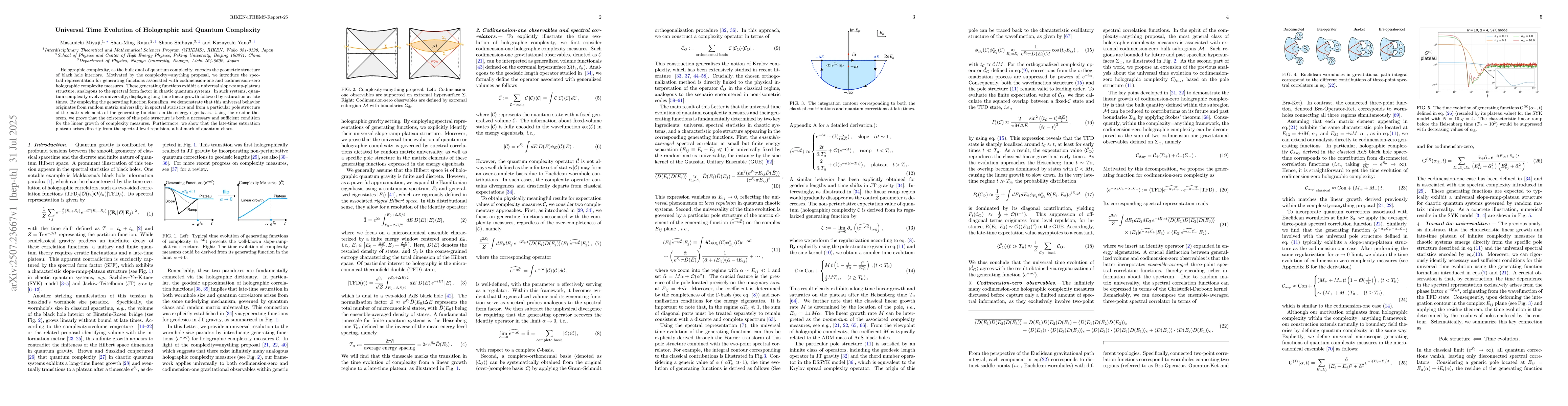 Holographic complexity, as the bulk dual of quantum complexity, encodes the geometric structure of black hole interiors. Motivated by the complexity=anything proposal, we introduce the spectral representation for generating functions associated with codimension-one and codimension-zero holographic complexity measures. These generating functions exhibit a universal slope-ramp-plateau structure, analogous to the spectral form factor in chaotic quantum systems. In such systems, quantum complexity evolves universally, displaying long-time linear growth followed by saturation at late times. By employing the generating function formalism, we demonstrate that this universal behavior originates from random matrix universality in spectral statistics and from a particular pole structure of the matrix elements of the generating functions in the energy eigenbasis. Using the residue theorem, we prove that the existence of this pole structure is both a necessary and sufficient condition for the linear growth of complexity measures. Furthermore, we show that the late-time saturation plateau arises directly from the spectral level repulsion, a hallmark of quantum chaos.