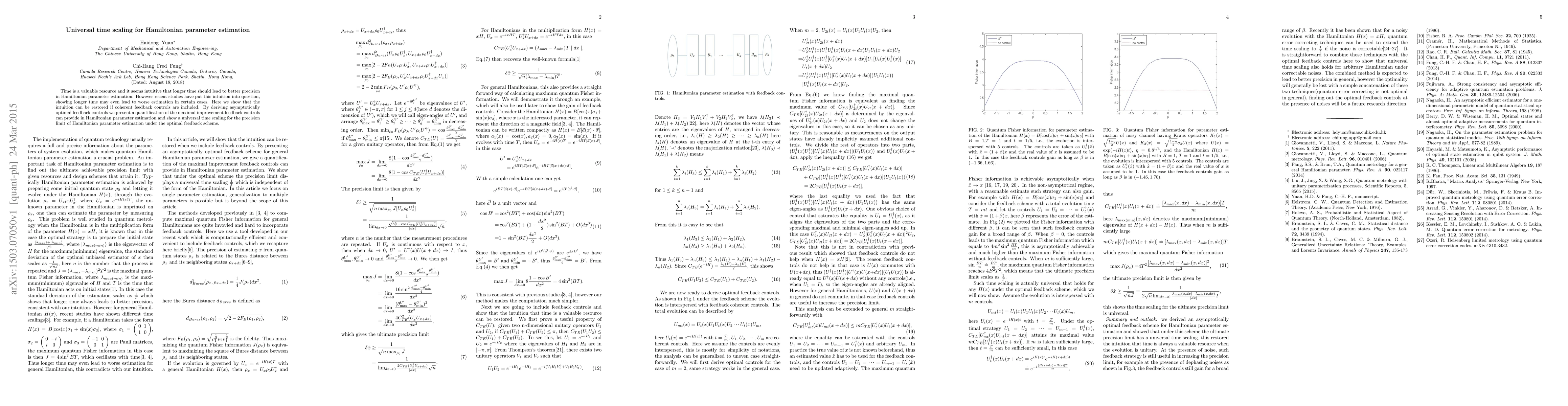 This paper demonstrates that coherent feedback controls can restore the intuition that longer time leads to better precision in Hamiltonian parameter estimation, presenting a universal time scaling for precision limits under optimal feedback schemes and quantifying the maximal improvement these controls can provide.