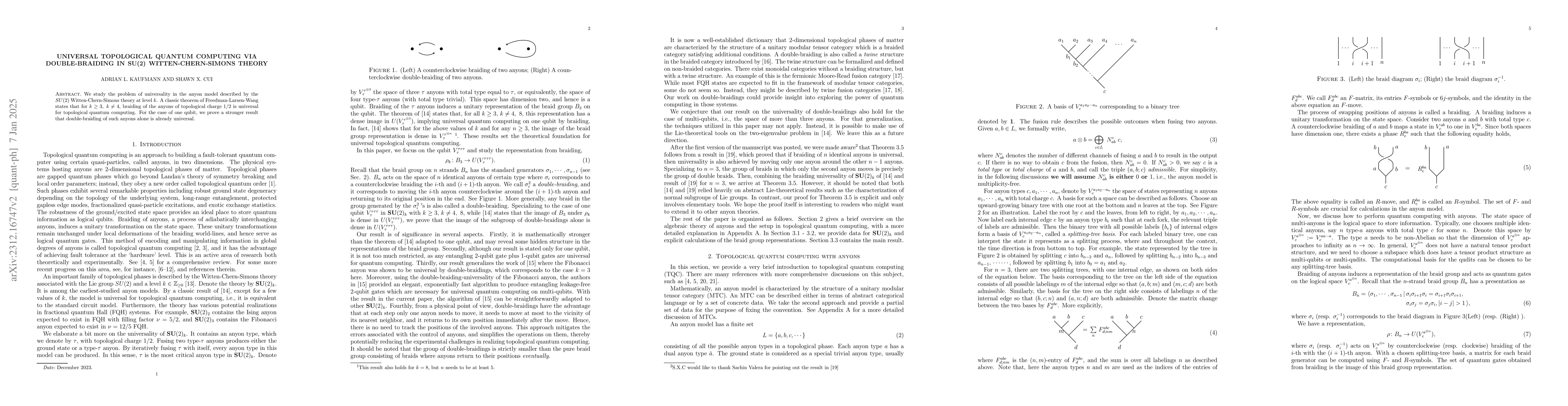 We study the problem of universality in the anyon model described by the $SU(2)$ Witten-Chern-Simons theory at level $k$. A classic theorem of Freedman-Larsen-Wang states that for $k \geq 3, \ k \neq 4$, braiding of the anyons of topological charge $1/2$ is universal for topological quantum computing. For the case of one qubit, we prove a stronger result that double-braiding of such anyons alone is already universal.