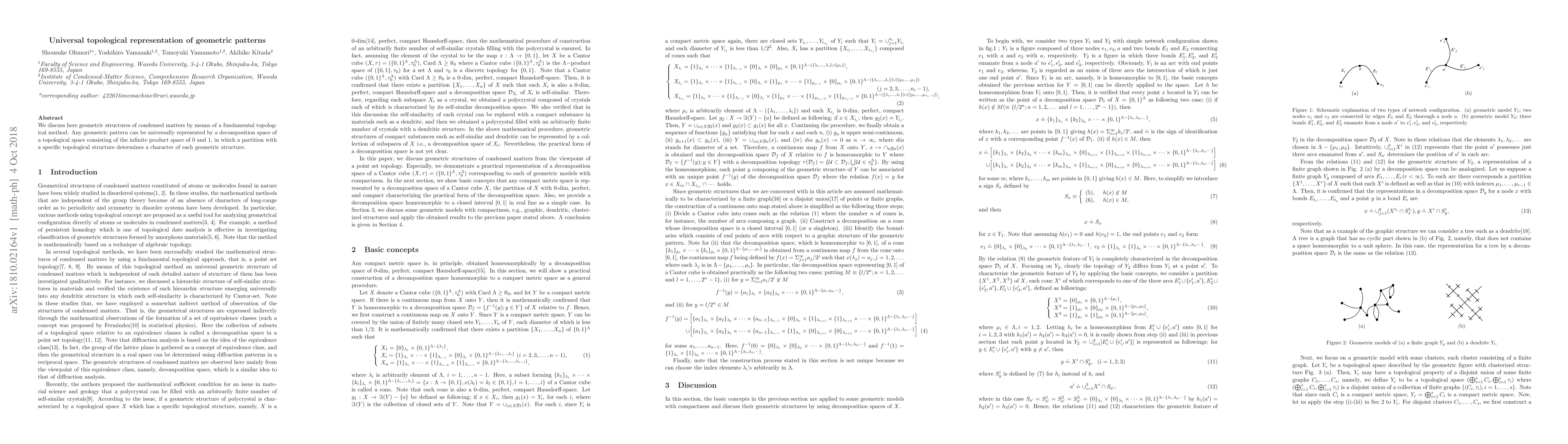 We discuss here geometric structures of condensed matters by means of a fundamental topological method. Any geometric pattern can be universally represented by a decomposition space of a topological space consisting of the infinite product space of 0 and 1, in which a partition with a specific topological structure determines a character of each geometric structure.
