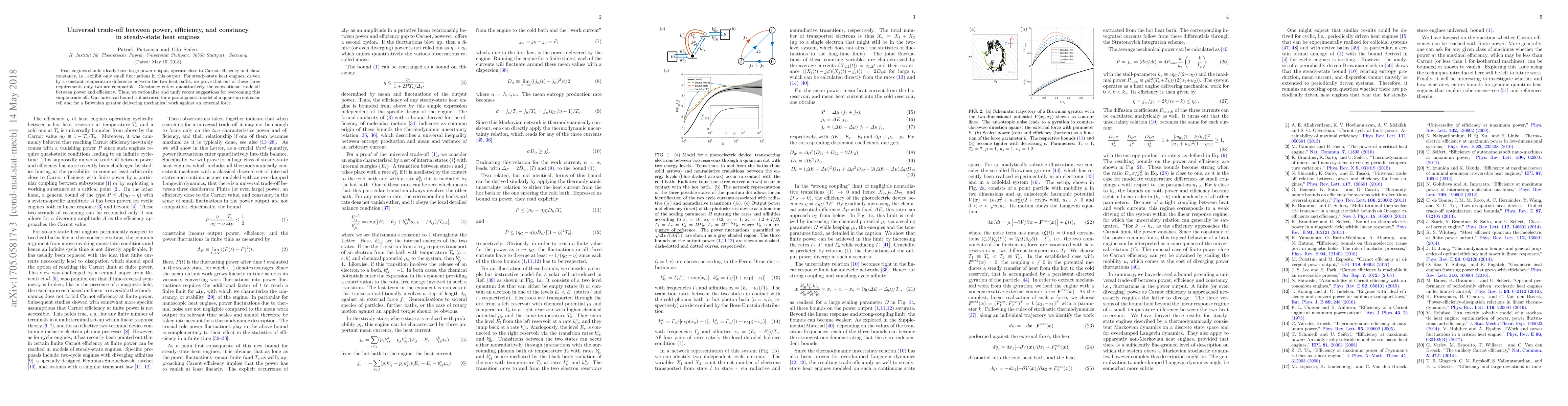 This paper proves that steady-state heat engines cannot simultaneously achieve large power output, high Carnot efficiency, and constancy (small fluctuations). It introduces a universal trade-off that quantifies the relationship between these three requirements, illustrating the findings with quantum dot solar cells and Brownian gyrators.