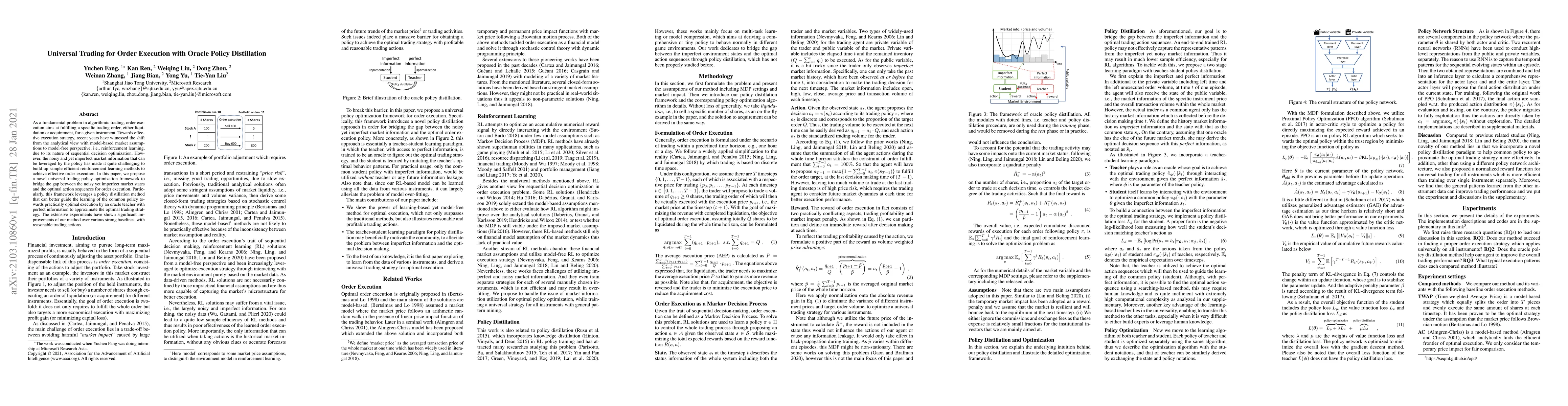 As a fundamental problem in algorithmic trading, order execution aims at fulfilling a specific trading order, either liquidation or acquirement, for a given instrument. Towards effective execution strategy, recent years have witnessed the shift from the analytical view with model-based market assumptions to model-free perspective, i.e., reinforcement learning, due to its nature of sequential decision optimization. However, the noisy and yet imperfect market information that can be leveraged by the policy has made it quite challenging to build up sample efficient reinforcement learning methods to achieve effective order execution. In this paper, we propose a novel universal trading policy optimization framework to bridge the gap between the noisy yet imperfect market states and the optimal action sequences for order execution. Particularly, this framework leverages a policy distillation method that can better guide the learning of the common policy towards practically optimal execution by an oracle teacher with perfect information to approximate the optimal trading strategy. The extensive experiments have shown significant improvements of our method over various strong baselines, with reasonable trading actions.