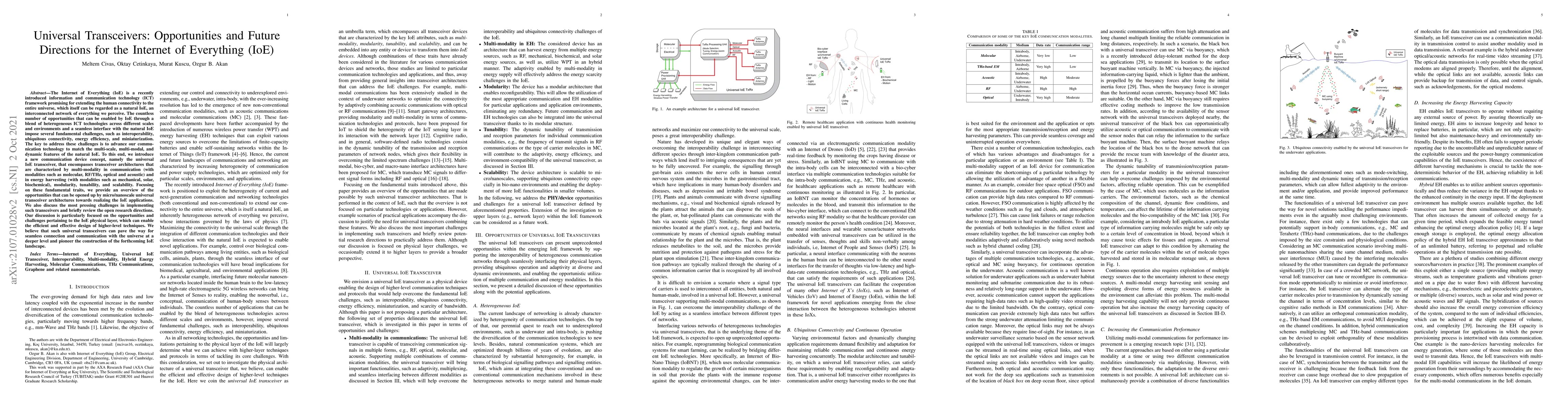 The paper introduces universal IoE transceivers as a solution to the challenges of interoperability, connectivity, energy efficiency, and miniaturization in the Internet of Everything (IoE). These transceivers feature multi-modal communication and energy harvesting, modularity, tunability, and scalability, promising to enable seamless connections across diverse environments and technologies.