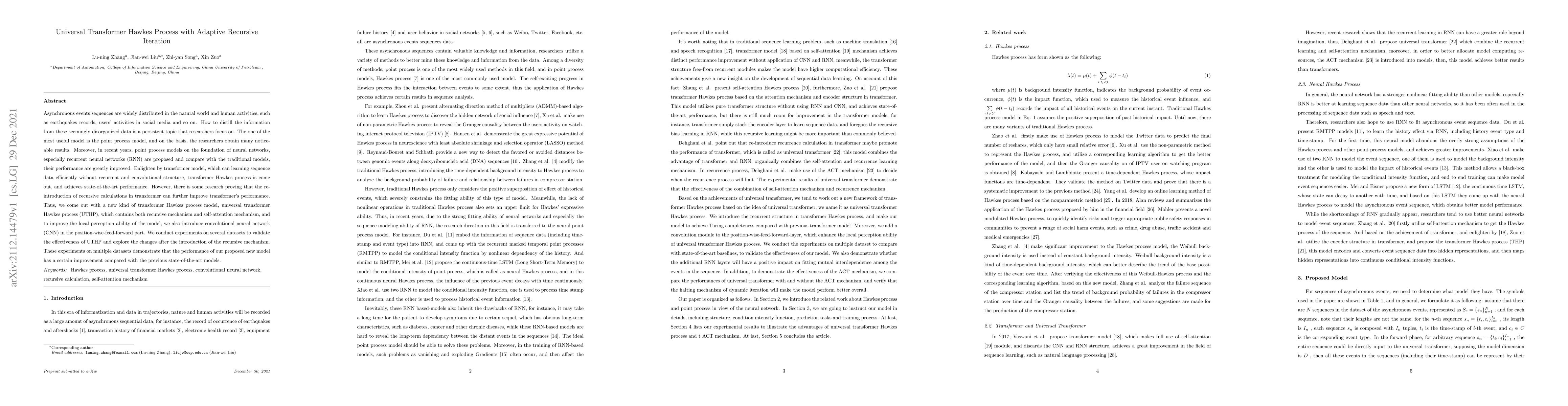 This research introduces a Universal Transformer Hawkes Process (UTHP) model that combines recursive mechanisms with self-attention and convolutional neural networks to improve the analysis of asynchronous event sequences. Experiments show that UTHP enhances performance compared to previous state-of-the-art models, indicating the benefits of integrating recursive calculations with transformer architectures.