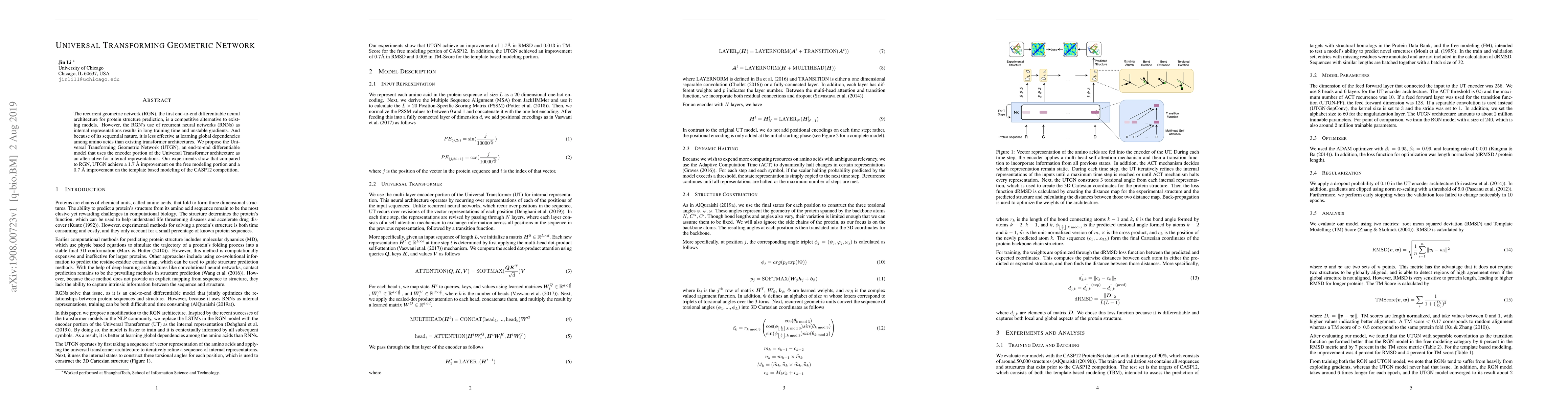 The Universal Transforming Geometric Network (UTGN) improves protein structure prediction by replacing recurrent neural networks with the encoder portion of the Universal Transformer architecture, achieving a $1.7$ µng improvement on free modeling and $0.7$ µng improvement on template-based modeling.
