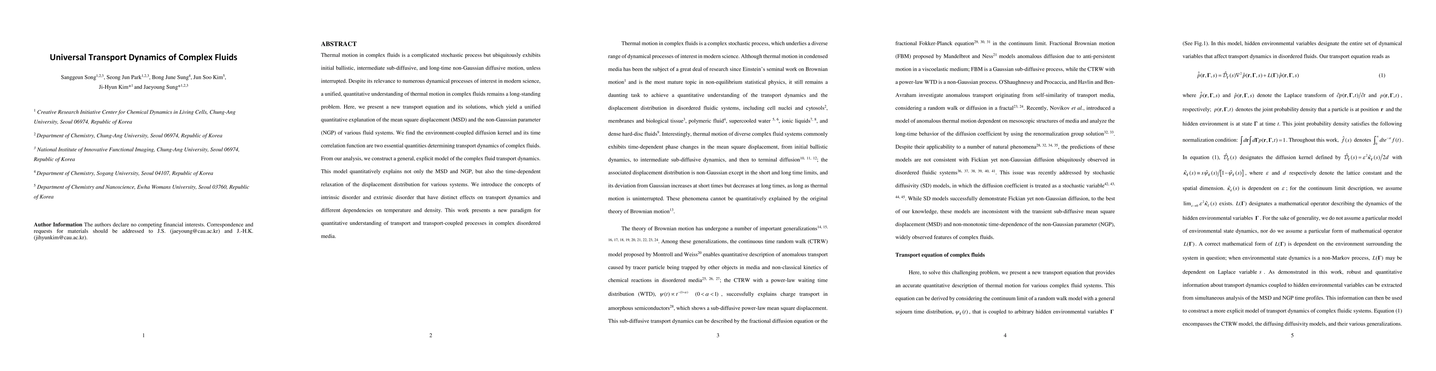 Thermal motion in complex fluids is a complicated stochastic process but ubiquitously exhibits initial ballistic, intermediate sub-diffusive, and long-time non-Gaussian diffusive motion, unless interrupted. Despite its relevance to numerous dynamical processes of interest in modern science, a unified, quantitative understanding of thermal motion in complex fluids remains a long-standing problem. Here, we present a new transport equation and its solutions, which yield a unified quantitative explanation of the mean square displacement (MSD) and the non-Gaussian parameter (NGP) of various fluid systems. We find the environment-coupled diffusion kernel and its time correlation function are two essential quantities determining transport dynamics of complex fluids. From our analysis, we construct a general, explicit model of the complex fluid transport dynamics. This model quantitatively explains not only the MSD and NGP, but also the time-dependent relaxation of the displacement distribution for various systems. We introduce the concepts of intrinsic disorder and extrinsic disorder that have distinct effects on transport dynamics and different dependencies on temperature and density. This work presents a new paradigm for quantitative understanding of transport and transport-coupled processes in complex disordered media.