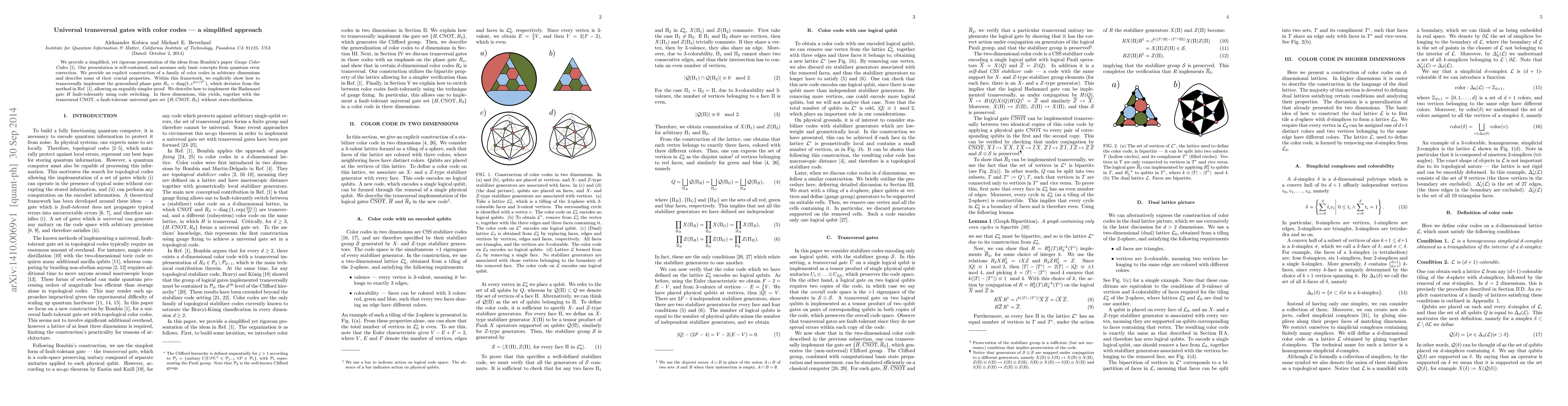 We provide a simplified, yet rigorous presentation of the ideas from Bomb\'{i}n's paper "Gauge Color Codes" [arXiv:1311.0879v3]. Our presentation is self-contained, and assumes only basic concepts from quantum error correction. We provide an explicit construction of a family of color codes in arbitrary dimensions and describe some of their crucial properties. Within this framework, we explicitly show how to transversally implement the generalized phase gate $R_n=\text{diag}(1,e^{2\pi i/2^n})$, which deviates from the method in "Gauge Color Codes", allowing an arguably simpler proof. We describe how to implement the Hadamard gate $H$ fault-tolerantly using code switching. In three dimensions, this yields, together with the transversal $CNOT$, a fault-tolerant universal gate set $\{H,CNOT,R_3\}$ without state-distillation.