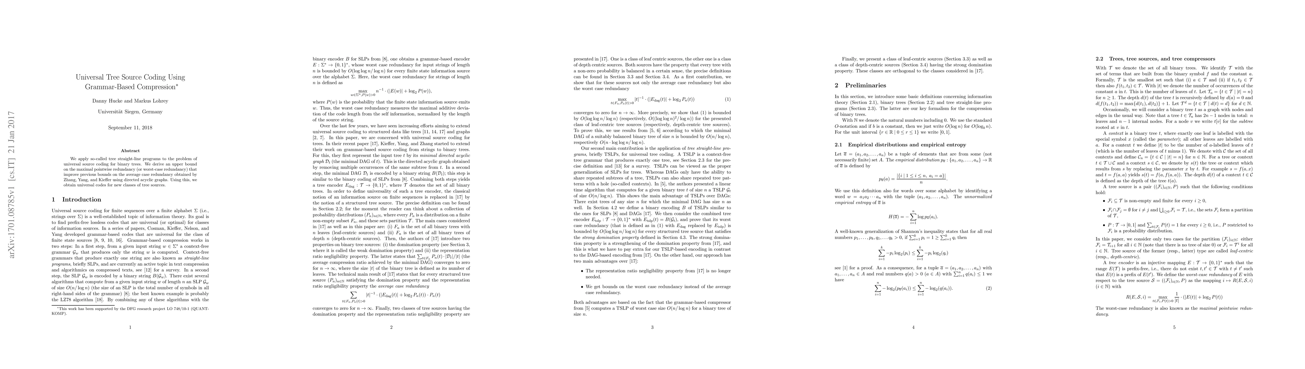 This paper introduces tree straight-line programs for lossless compression of binary trees, deriving improved upper bounds on maximal pointwise redundancy over previous methods. It also develops universal codes for new classes of structured tree sources.