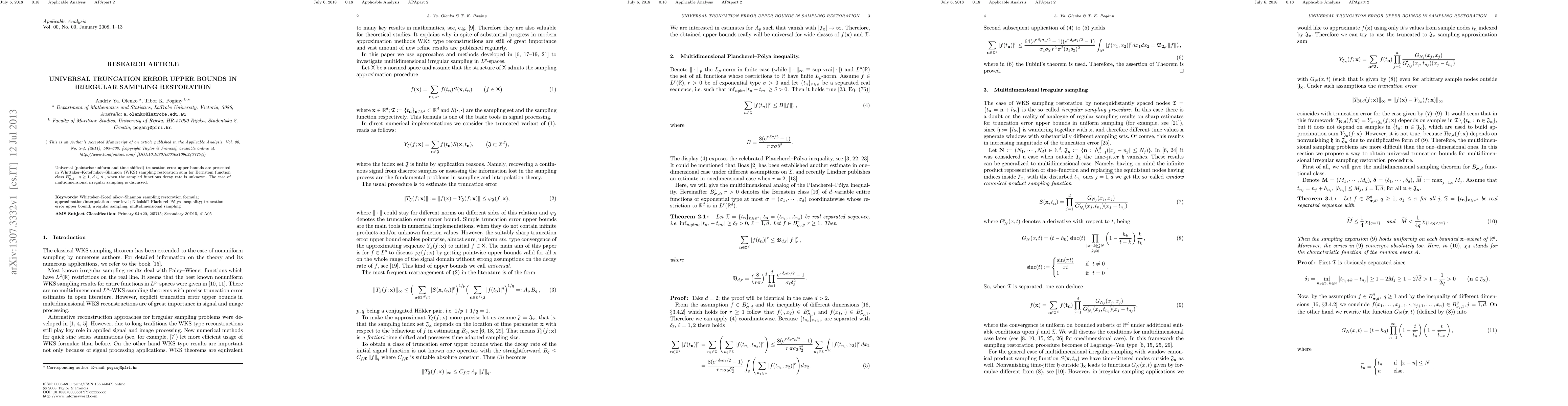The paper's main technical contribution is the establishment of universal truncation error upper bounds for irregular sampling in multidimensional spaces, extending previous work to a broader class of functions without assuming known decay rates.
