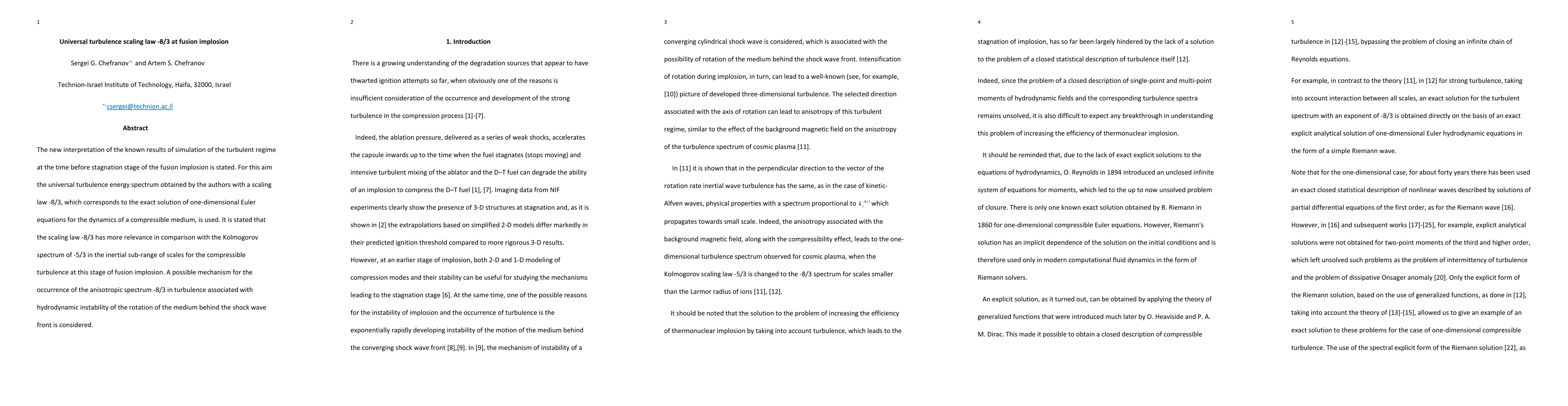 The new interpretation of the known results of simulation of the turbulent regime at the time before stagnation stage of the fusion implosion is stated. For this aim the universal turbulence energy spectrum obtained by the authors with a scaling law -8/3, which corresponds to the exact solution of one-dimensional Euler equations for the dynamics of a compressible medium, is used. It is stated that the scaling law -8/3 has more relevance in comparison with the Kolmogorov spectrum of -5/3 in the inertial sub-range of scales for the compressible turbulence at this stage of fusion implosion. A possible mechanism for the occurrence of the anisotropic spectrum -8/3 in turbulence associated with hydrodynamic instability of the rotation of the medium behind the shock wave front is considered.