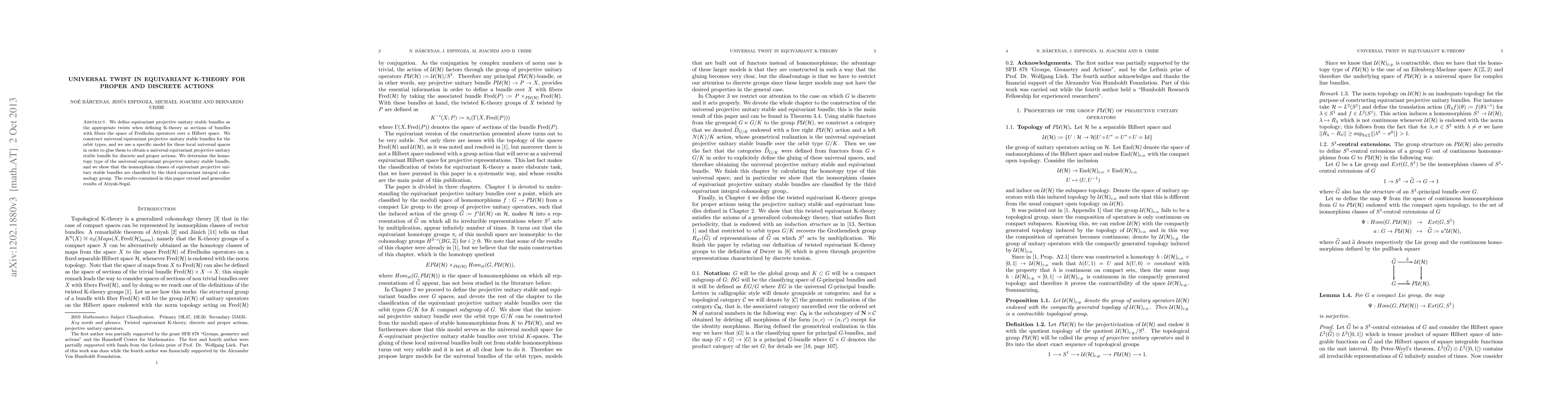 We define equivariant projective unitary stable bundles as the appropriate twists when defining K-theory as sections of bundles with fibers the space of Fredholm operators over a Hilbert space. We construct universal equivariant projective unitary stable bundles for the orbit types, and we use a specific model for these local universal spaces in order to glue them to obtain a universal equivariant projective unitary stable bundle for discrete and proper actions. We determine the homotopy type of the universal equivariant projective unitary stable bundle, and we show that the isomorphism classes of equivariant projective unitary stable bundles are classified by the third equivariant integral cohomology group. The results contained in this paper extend and generalize results of Atiyah-Segal.