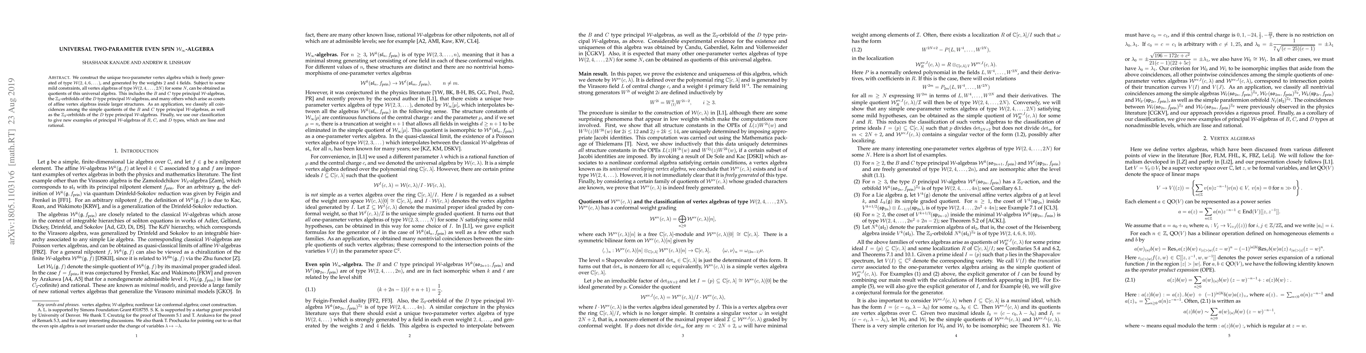 We construct the unique two-parameter vertex algebra which is freely generated of type ${\mathcal W}(2,4,6,\dots)$, and generated by the weights $2$ and $4$ fields. Subject to some mild constraints, all vertex algebras of type ${\mathcal W}(2,4,\dots, 2N)$ for some $N$, can be obtained as quotients of this universal algebra. This includes the $B$ and $C$ type principal ${\mathcal W}$-algebras, the $\mathbb{Z}_2$-orbifolds of the $D$ type principal ${\mathcal W}$-algebras, and many others which arise as cosets of affine vertex algebras inside larger structures. As an application, we classify all coincidences among the simple quotients of the $B$ and $C$ type principal ${\mathcal W}$-algebras, as well as the $\mathbb{Z}_2$-orbifolds of the $D$ type principal ${\mathcal W}$-algebras. Finally, we use our classification to give new examples of principal ${\mathcal W}$-algebras of $B$, $C$, and $D$ types, which are lisse and rational.