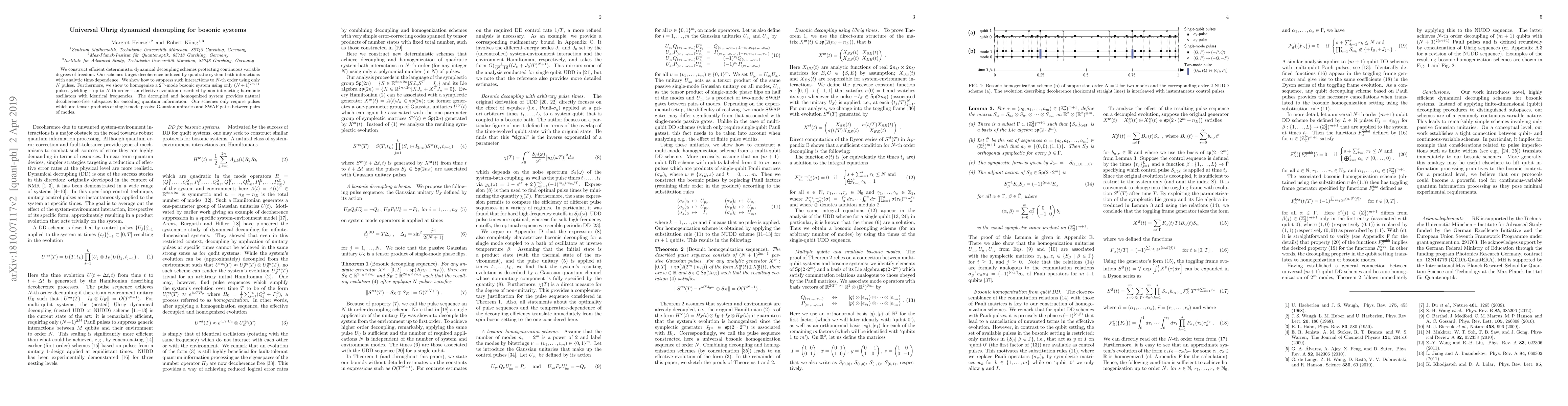 This paper presents universal dynamical decoupling schemes for bosonic systems that suppress decoherence from quadratic interactions to any specified order using a minimal number of pulses. The proposed method effectively homogenizes multi-mode bosonic systems, creating decoherence-free subspaces for quantum information encoding.