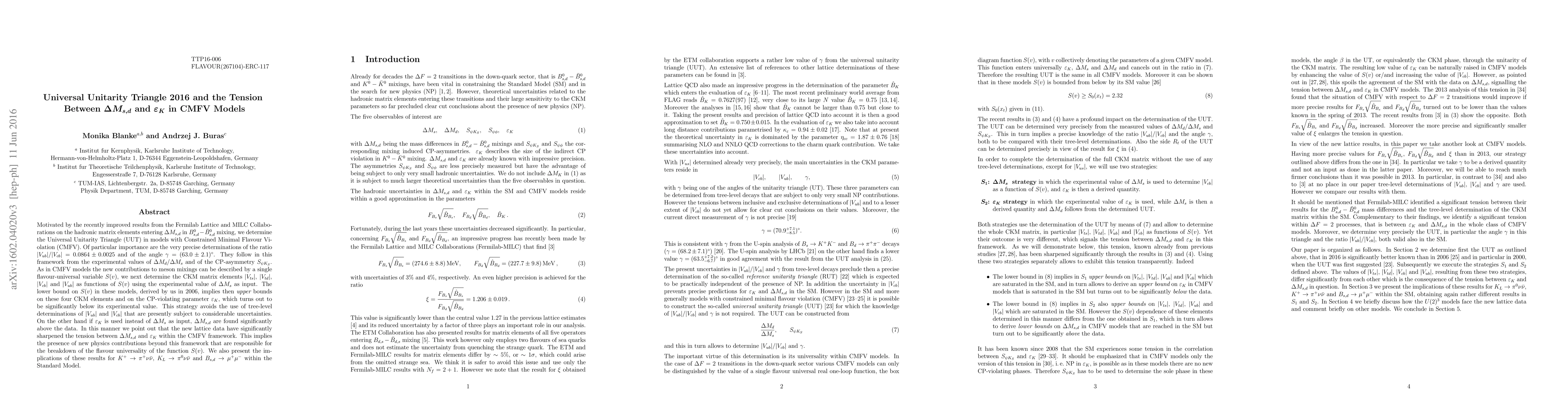Motivated by the recently improved results from the Fermilab Lattice and MILC Collaborations on the hadronic matrix elements entering $\Delta M_{s,d}$ in $B_{s,d}^0-\bar B_{s,d}^0$ mixing, we determine the Universal Unitarity Triangle (UUT) in models with Constrained Minimal Flavour Violation (CMFV). Of particular importance are the very precise determinations of the ratio $|V_{ub}|/|V_{cb}|=0.0864\pm0.0025$ and of the angle $\gamma=(63.0\pm 2.1)^\circ$. They follow in this framework from the experimental values of $\Delta M_{d}/\Delta M_s$ and of the CP-asymmetry $S_{\psi K_S}$. As in CMFV models the new contributions to meson mixings can be described by a single flavour-universal variable $S(v)$, we next determine the CKM matrix elements $|V_{ts}|$, $|V_{td}|$, $|V_{cb}|$ and $|V_{ub}|$ as functions of $S(v)$ using the experimental value of $\Delta M_s$ as input. The lower bound on $S(v)$ in these models, derived by us in 2006, implies then upper bounds on these four CKM elements and on the CP-violating parameter $\varepsilon_K$, which turns out to be significantly below its experimental value. This strategy avoids the use of tree-level determinations of $|V_{ub}|$ and $|V_{cb}|$ that are presently subject to considerable uncertainties. On the other hand if $\varepsilon_K$ is used instead of $\Delta M_s$ as input, $\Delta M_{s,d}$ are found significantly above the data. In this manner we point out that the new lattice data have significantly sharpened the tension between $\Delta M_{s,d}$ and $\varepsilon_K$ within the CMFV framework. This implies the presence of new physics contributions beyond this framework that are responsible for the breakdown of the flavour universality of the function $S(v)$. We also present the implications of these results for $K^+\to\pi^+\nu\bar\nu$, $K_L\to\pi^0\nu\bar\nu$ and $B_{s,d}\to\mu^+\mu^-$ within the Standard Model.