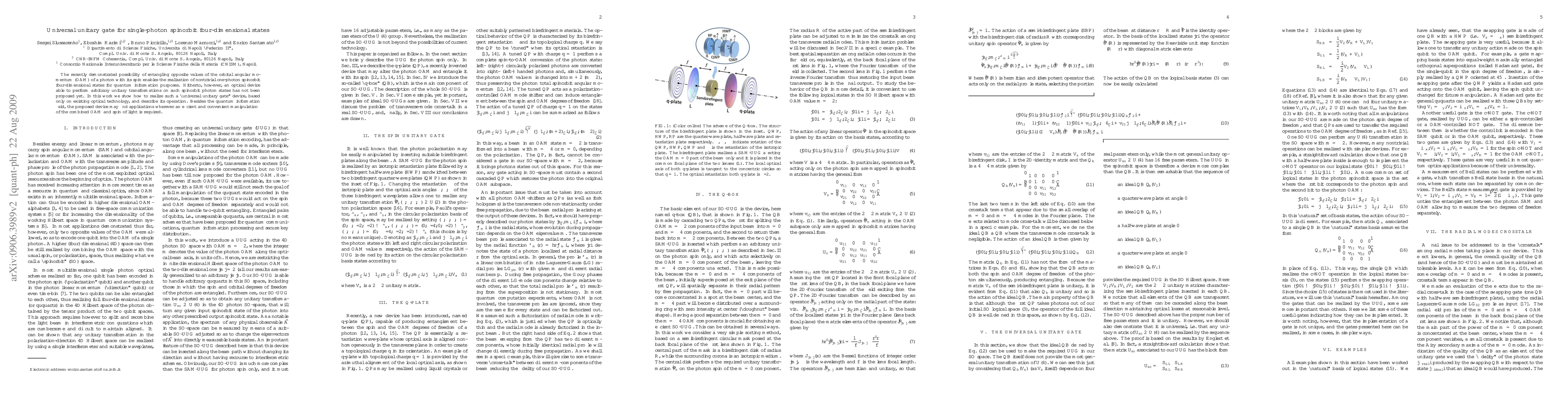 This paper presents a universal unitary gate for manipulating four-dimensional single-photon spin-orbit states, enabling the realization of arbitrary transformations on these states using existing optical technology. Such a device has potential applications beyond quantum information, particularly in any field requiring efficient control of photon orbital angular momentum and spin.