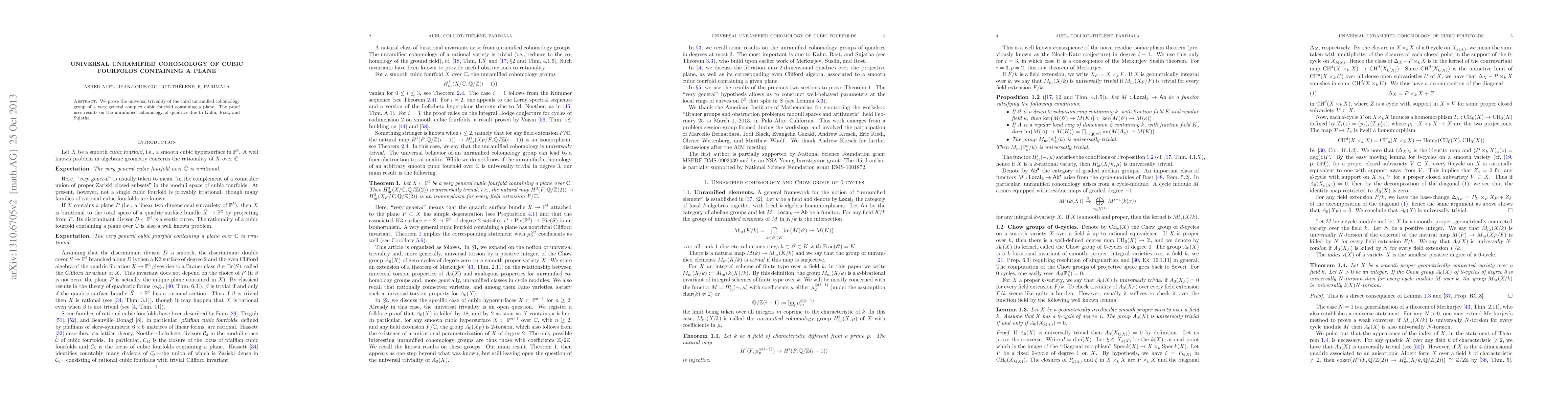 Summary: This paper establishes that the third unramified cohomology group of typical cubic fourfolds that include a plane is universally trivial, leveraging prior findings on quadrics' unramified cohomology by Kahn, Rost, and Sujatha.