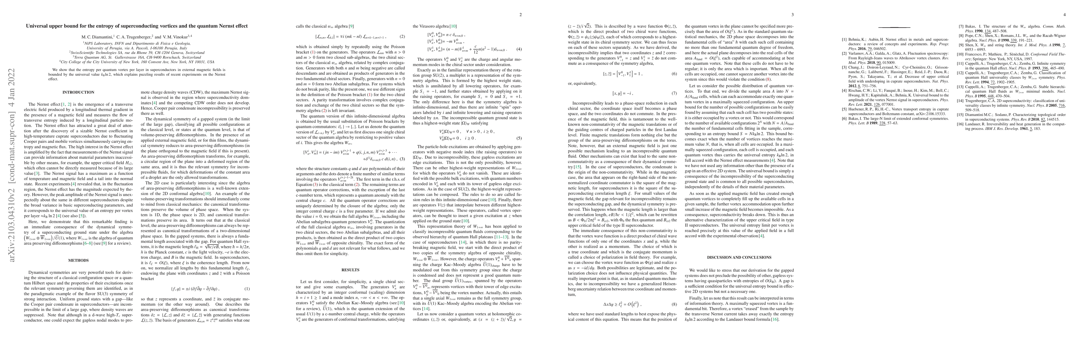 This paper establishes a universal upper bound of k_B ln 2 for the entropy per quantum vortex per layer in superconductors, providing an explanation for recent experimental observations of the Nernst effect.