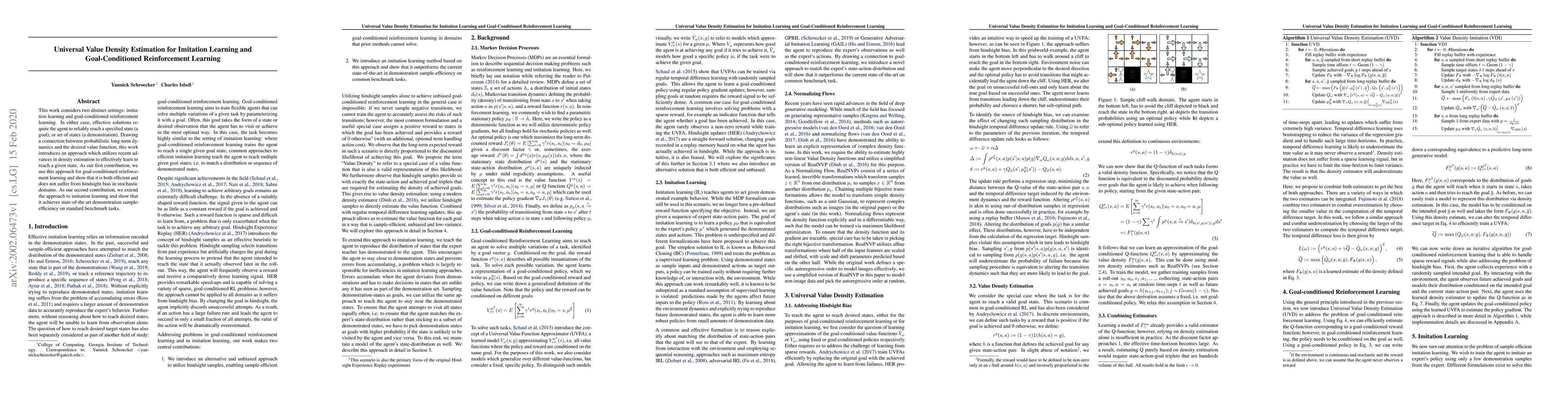 This paper introduces a universal value density estimation method for both imitation learning and goal-conditioned reinforcement learning, demonstrating efficiency and no hindsight bias in stochastic environments. It also achieves state-of-the-art sample-efficiency in imitation learning benchmarks.