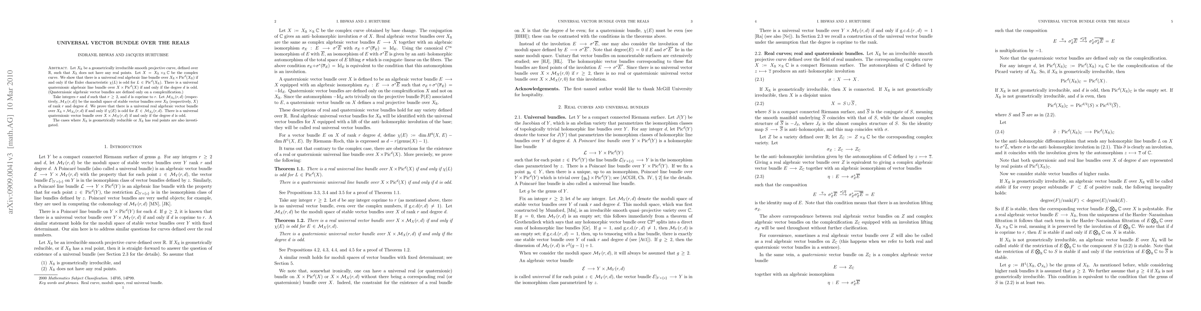 Let X_R be a geometrically irreducible smooth projective curve, defined over R, such that X_R does not have any real points. Let X= X_R\times_R C be the complex curve. We show that there is a universal real algebraic line bundle over X_R x Pic^d(X_R)$ if and only if $\chi(L)$ is odd for L in Pic^d(X_R)$. There is a universal quaternionic algebraic line bundle over X x Pic^d(X) if and only if the degree d is odd. Take integers r and d such that r > 1, and d is coprime to r. Let M_{X_R}(r,d) (respectively, M_X(r,d)$) be the moduli space of stable vector bundles over X_R (respectively, X) of rank r and degree d. We prove that there is a universal real algebraic vector bundle over X_R x M_{X_R}(r,d) if and only if \chi(E) is odd for E in M_{X_R}(r,d). There is a universal quaternionic vector bundle over X x M_X(r,d) if and only if the degree d is odd. The cases where X_R is geometrically reducible or X_R has real points are also investigated.
