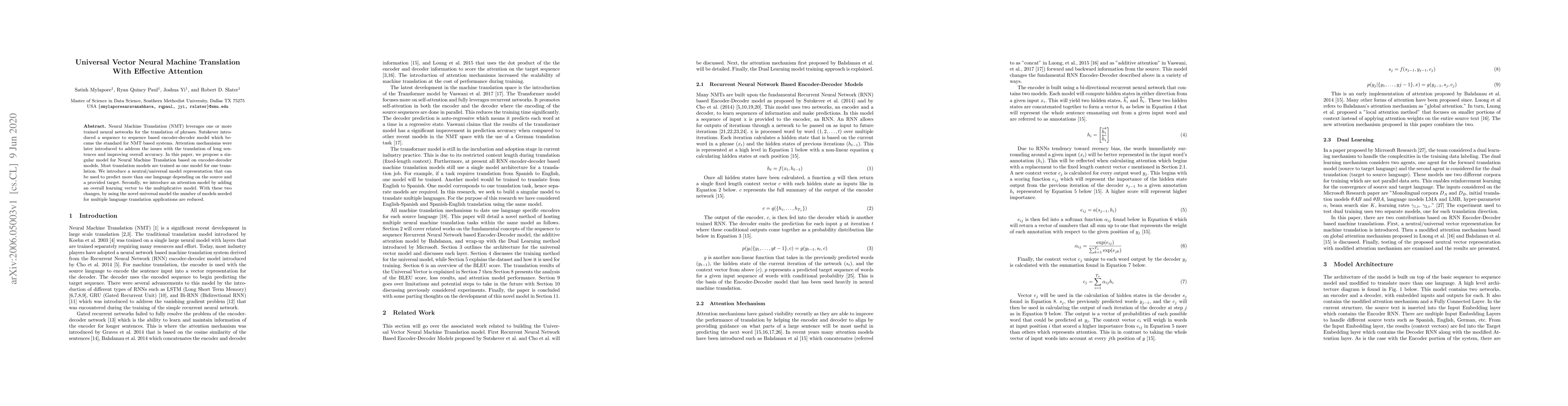 This paper proposes a universal vector neural machine translation model based on an encoder-decoder framework with an effective attention mechanism. It aims to reduce the number of models needed for multiple language translation by introducing a single model adaptable to various languages.