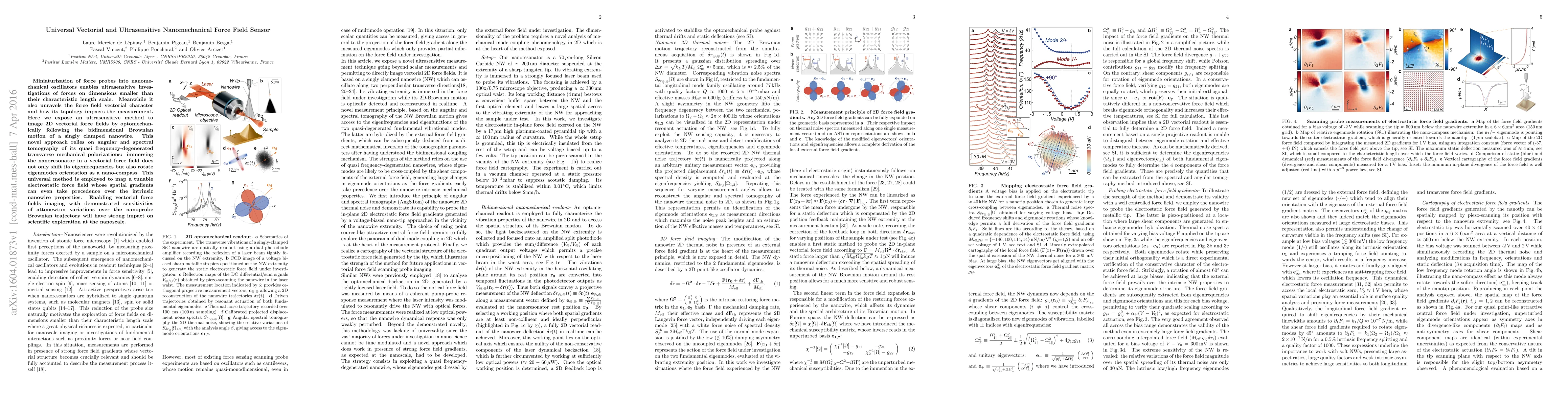 Miniaturization of force probes into nanomechanical oscillators enables ultrasensitive investigations of forces on dimensions smaller than their characteristic length scale. Meanwhile it also unravels the force field vectorial character and how its topology impacts the measurement. Here we expose an ultrasensitive method to image 2D vectorial force fields by optomechanically following the bidimensional Brownian motion of a singly clamped nanowire. This novel approach relies on angular and spectral tomography of its quasi frequency-degenerated transverse mechanical polarizations: immersing the nanoresonator in a vectorial force field does not only shift its eigenfrequencies but also rotate eigenmodes orientation as a nano-compass. This universal method is employed to map a tunable electrostatic force field whose spatial gradients can even take precedence over the intrinsic nanowire properties. Enabling vectorial force fields imaging with demonstrated sensitivities of attonewton variations over the nanoprobe Brownian trajectory will have strong impact on scientific exploration at the nanoscale.