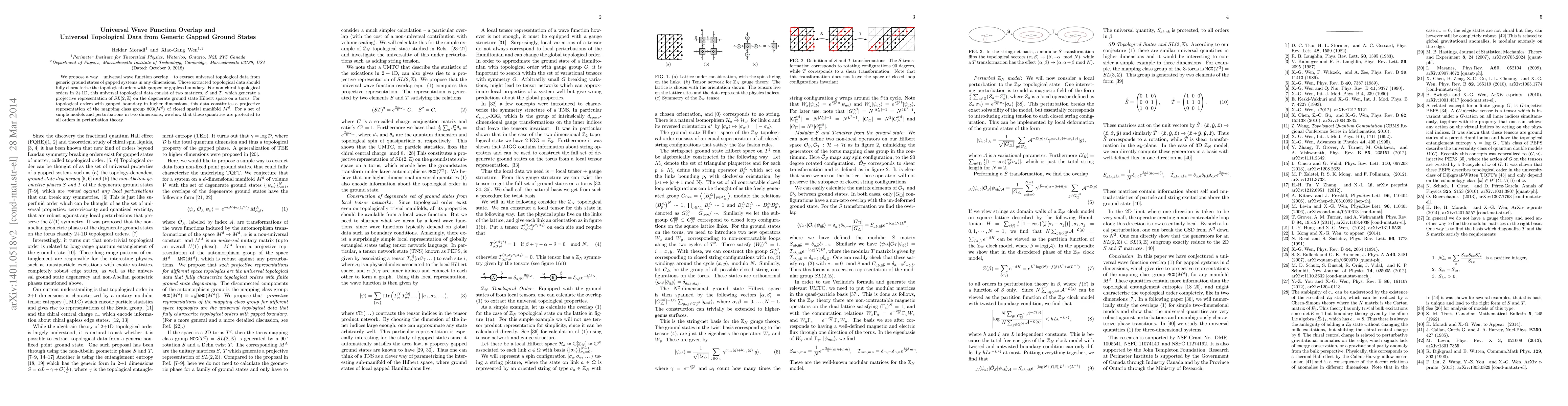 We propose a way -- universal wave function overlap -- to extract universal topological data from generic ground states of gapped systems in any dimensions. Those extracted topological data should fully characterize the topological orders with gapped or gapless boundary. For non-chiral topological orders in 2+1D, this universal topological data consist of two matrices, $S$ and $T$, which generate a projective representation of $SL(2,\mathbb Z)$ on the degenerate ground state Hilbert space on a torus. For topological orders with gapped boundary in higher dimensions, this data constitutes a projective representation of the mapping class group $MCG(M^d)$ of closed spatial manifold $M^d$. For a set of simple models and perturbations in two dimensions, we show that these quantities are protected to all orders in perturbation theory.