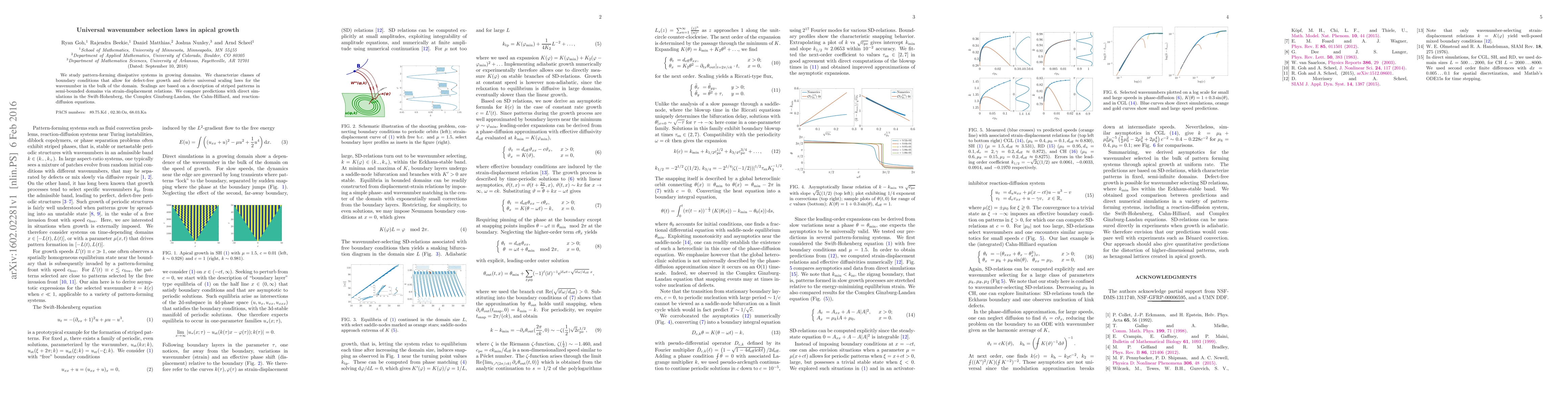 This paper investigates pattern-forming systems in growing domains, identifying boundary conditions that enable defect-free growth and deriving universal wavenumber scaling laws. The findings are validated through simulations of several well-known partial differential equations.