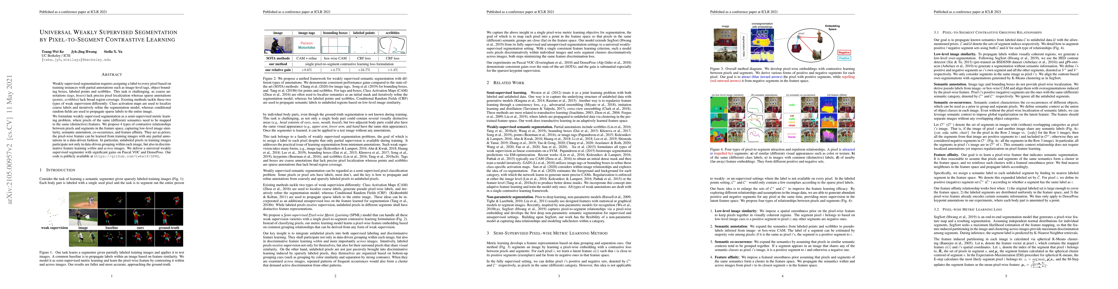 This paper proposes a novel method for universal weakly supervised segmentation using pixel-to-segment contrastive learning. It formulates the task as a semi-supervised metric learning problem, leveraging four types of contrastive relationships to map pixels to features, enabling effective segmentation from various partial annotations.