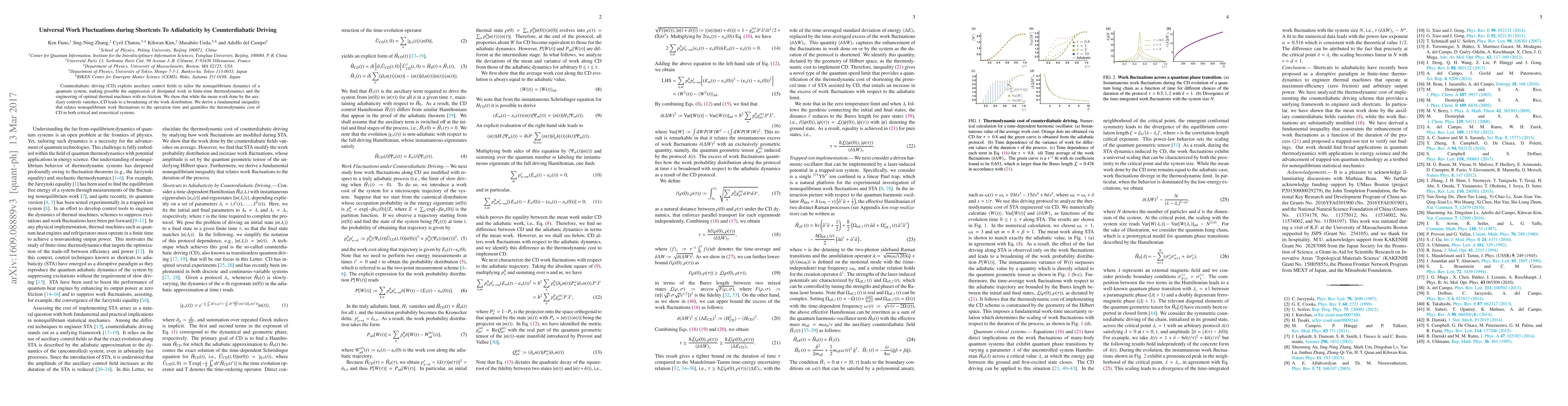 This paper investigates the universal fluctuations in work during shortcuts to adiabaticity using counterdiabatic driving, revealing that while mean work vanishes, the work distribution broadens. It establishes a fundamental inequality linking nonequilibrium work fluctuations to operation time, quantifying the thermodynamic cost of counterdiabatic driving in both critical and noncritical systems.