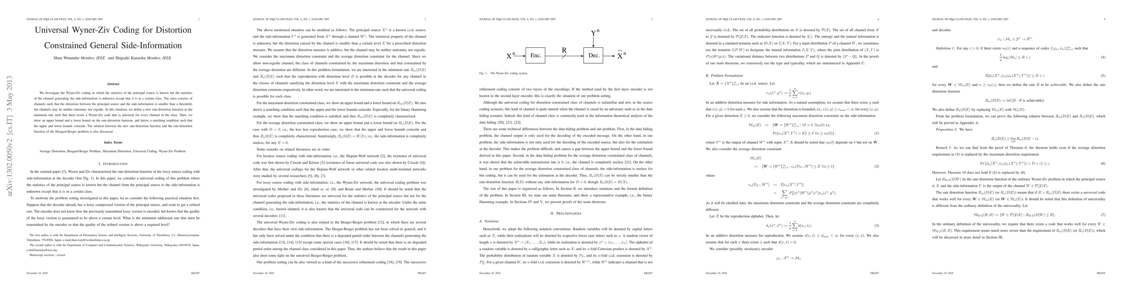 This paper explores universal Wyner-Ziv coding for a principal source with unknown side-information channel statistics, focusing on channels where the distortion is constrained. It establishes a new rate-distortion function and provides bounds that match, discussing its relation to the Heegard-Berger rate-distortion function.
