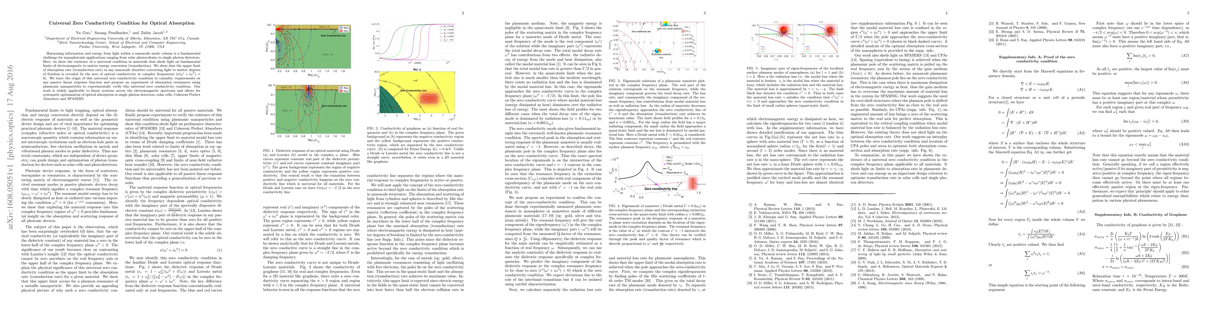 Harnessing information and energy from light within a nanoscale mode volume is a fundamental challenge for nanophotonic applications ranging from solar photovoltaics to single photon detectors. Here, we show the existence of a universal condition in materials that sheds light on fundamental limits of electromagnetic to matter energy conversion (transduction). We show that the upper limit of absorption rate (transduction rate) in any nanoscale absorber converting light to matter degrees of freedom is revealed by the zero of optical conductivity at complex frequencies ($\sigma(\omega^\prime + i\omega^{\prime\prime})= 0$). We trace the origin of this universal zero conductivity condition to causality requirements on any passive linear response function and propose an experiment of absorption resonances using plasmonic nanoparticles to experimentally verify this universal zero conductivity condition. Our work is widely applicable to linear systems across the electromagnetic spectrum and allows for systematic optimization of optical absorption in single photon detectors, solar cells, Coherent Perfect Absorbers and SPASERS.