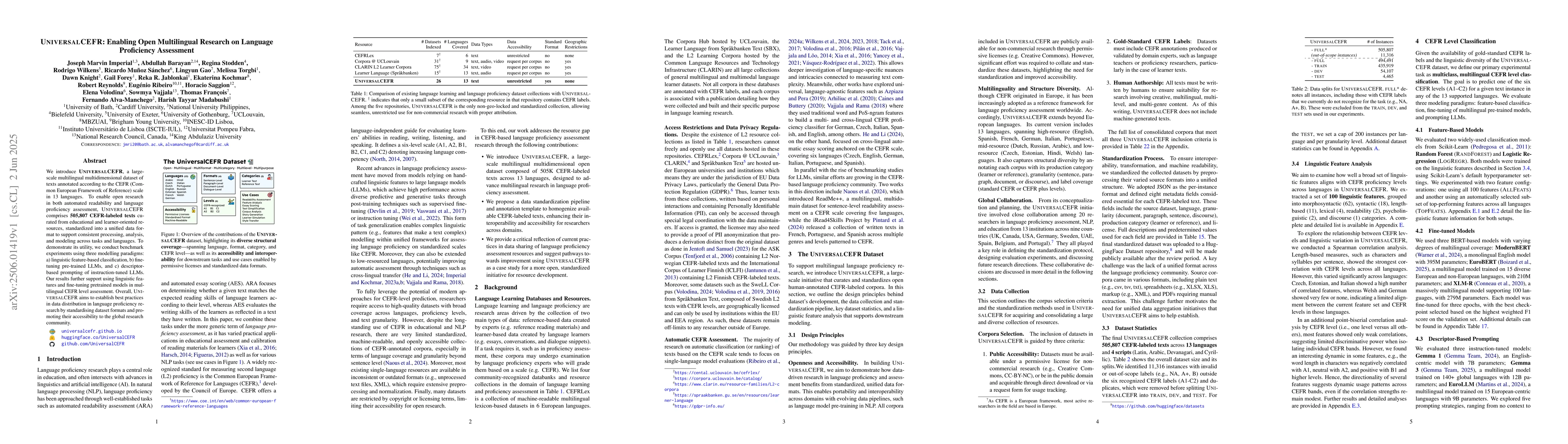 UniversalCEFR is a large multilingual dataset of annotated texts according to the CEFR scale in 13 languages, enabling open research in language proficiency assessment with standardized data formats and accessibility.